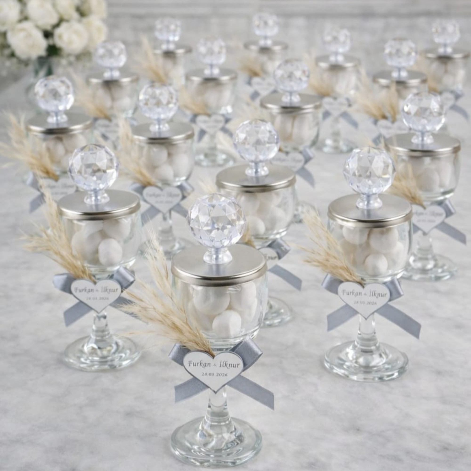 El emeğiyle hazırlanmış badem şekerli kadeh hediyelik, davetlileriniz için her biri özenle hazırlanmış ve kaliteli malzemelerle üretilmiştir.