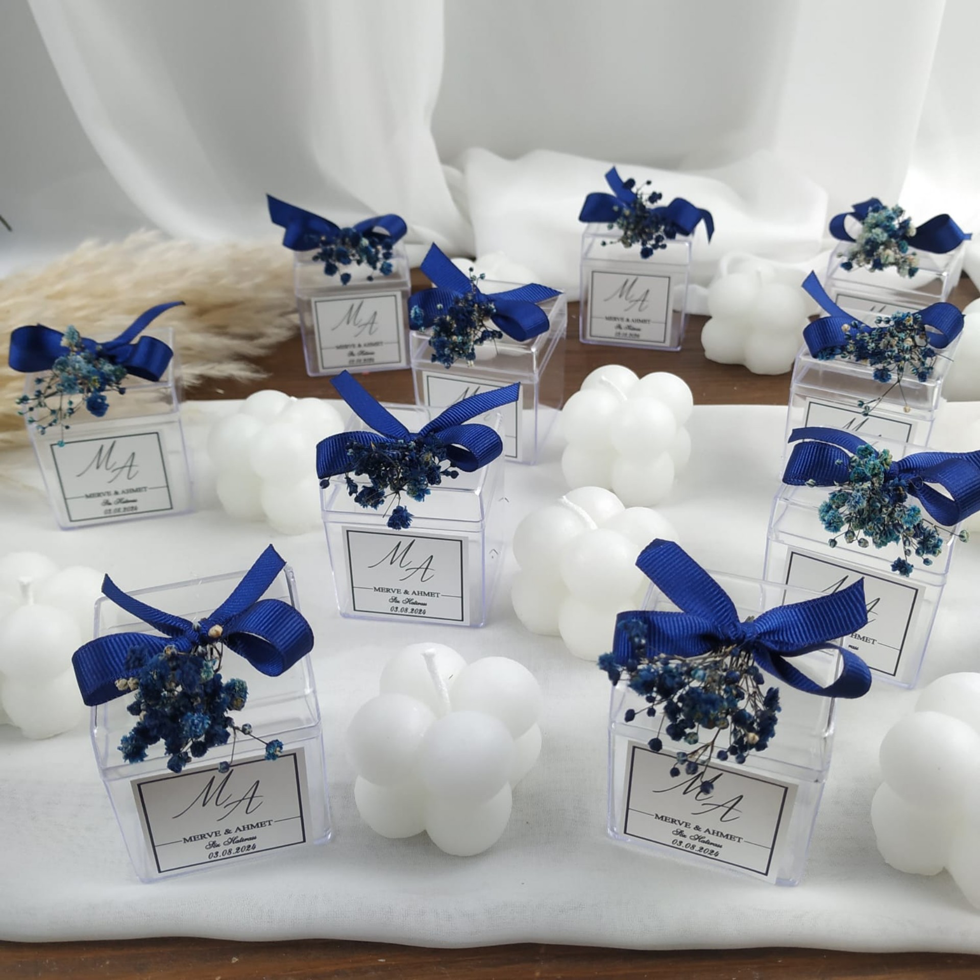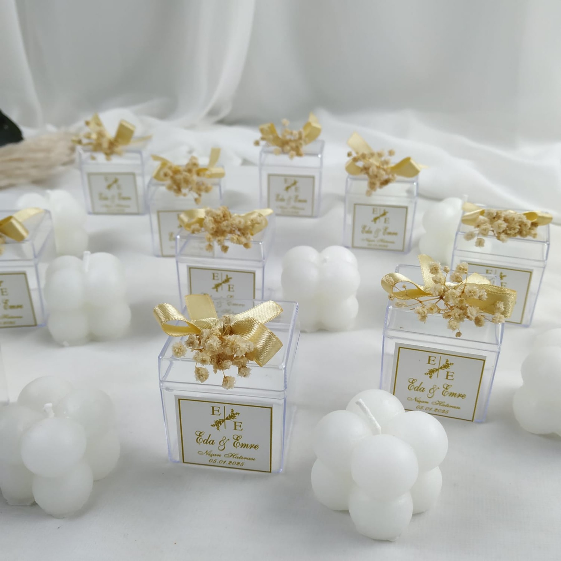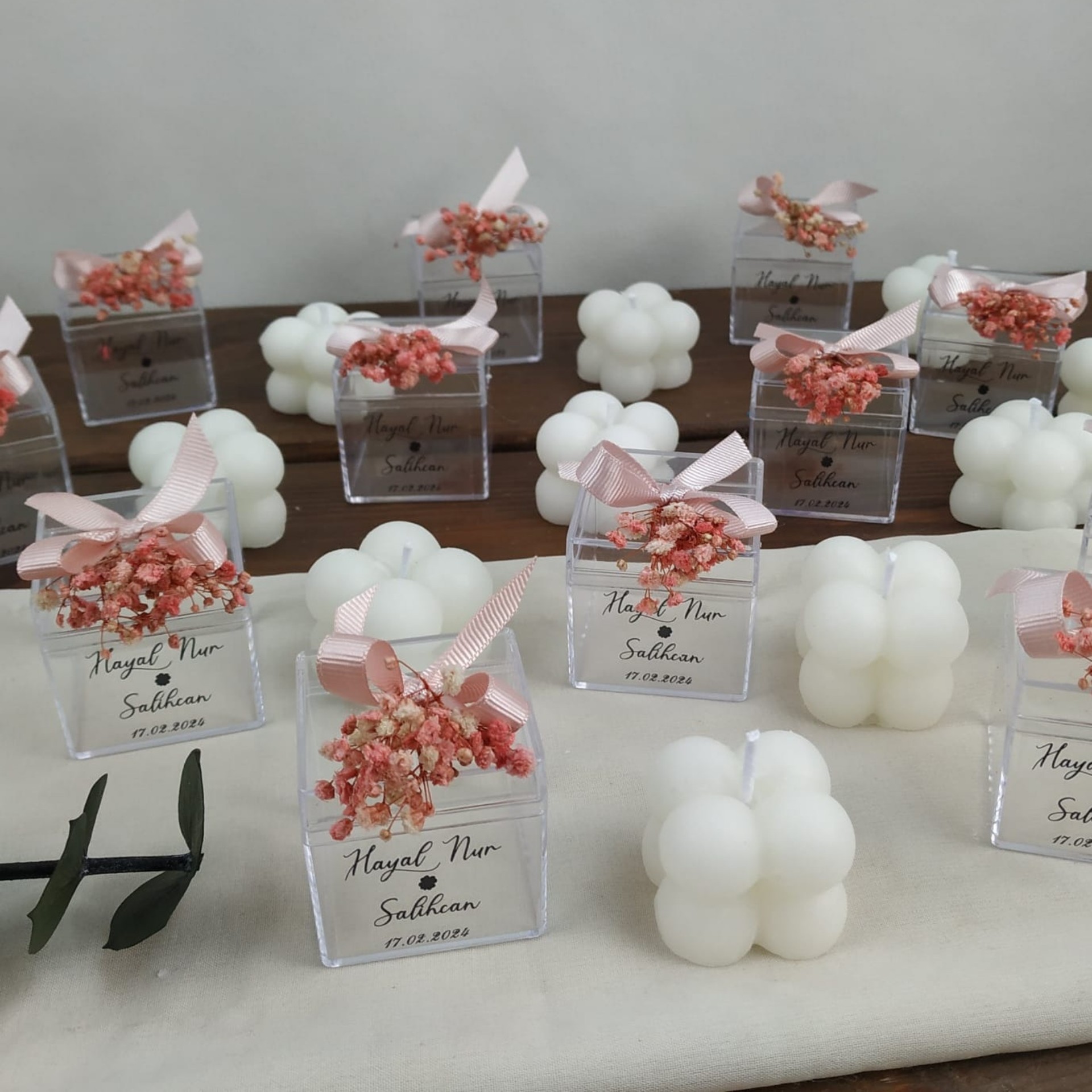 El emeğiyle hazırlanmış bubble mum hediyelik, davetlileriniz için her biri özenle hazırlanmış ve kaliteli malzemelerle üretilmiştir.