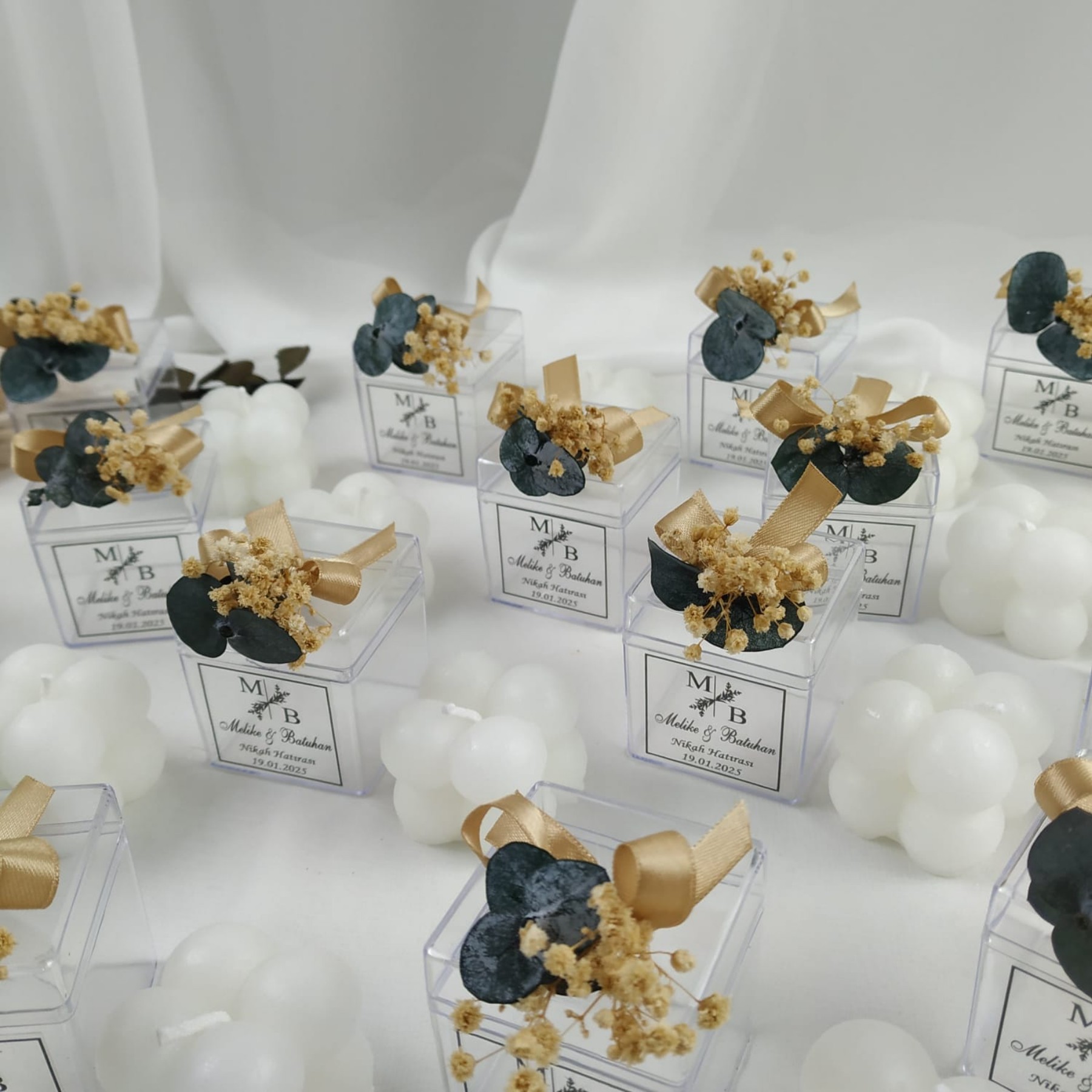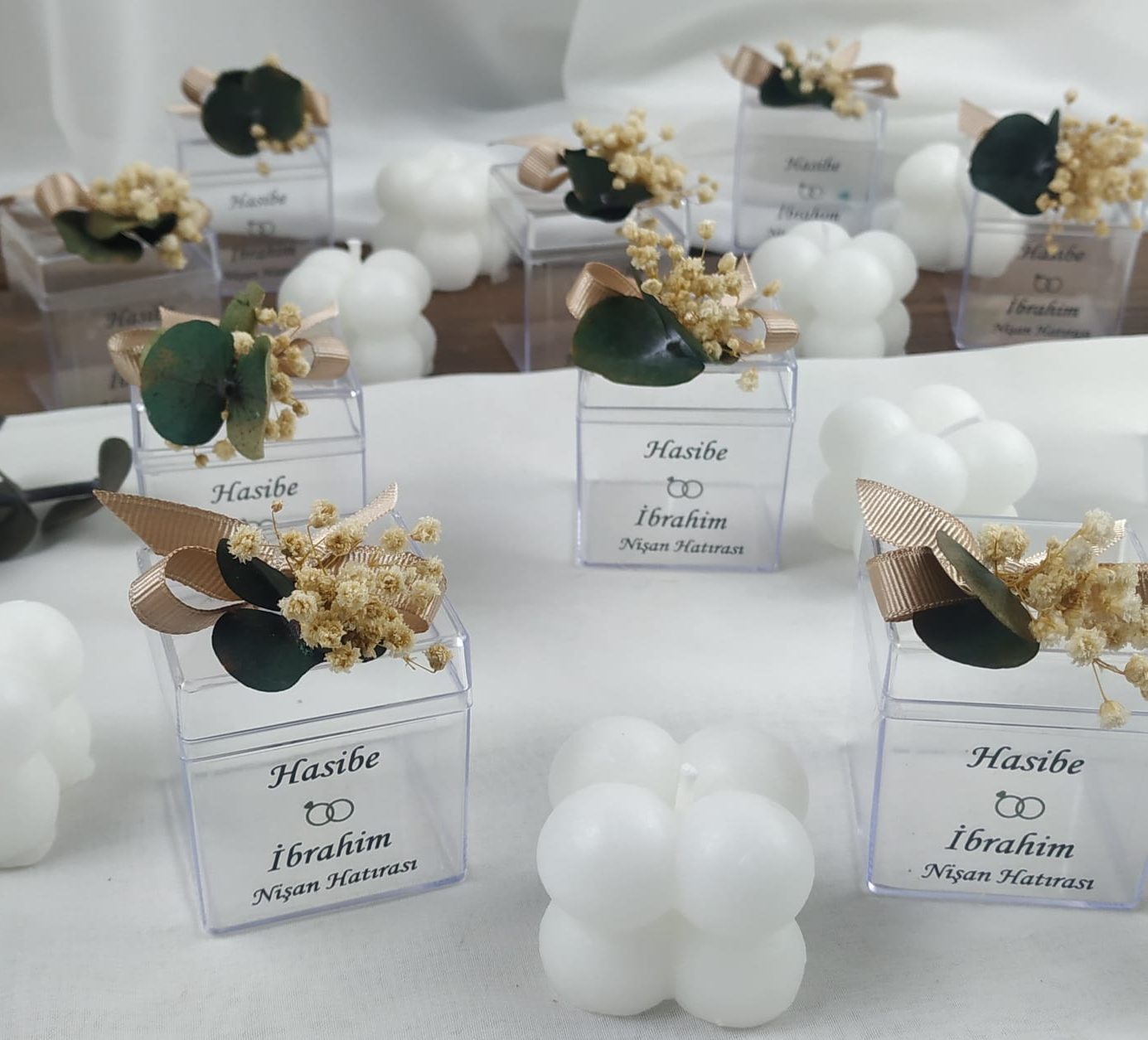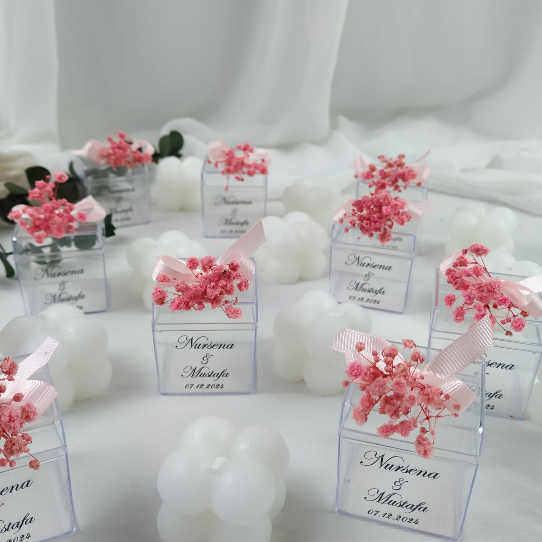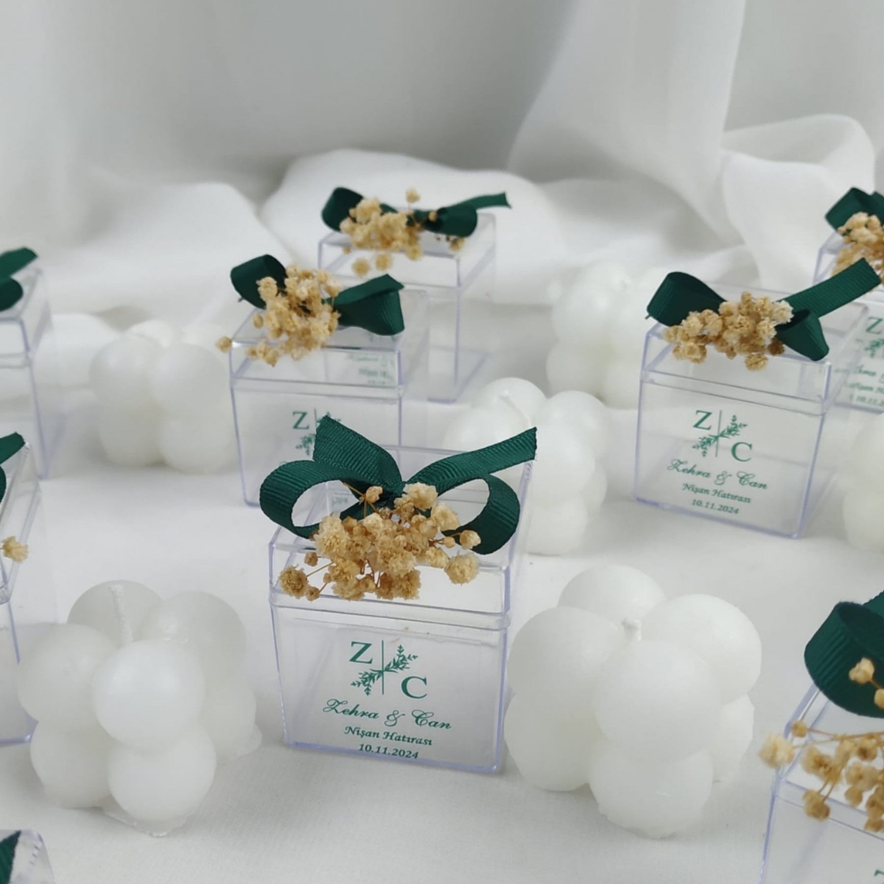 El emeğiyle hazırlanmış bubble mum hediyelik, davetlileriniz için her biri özenle hazırlanmış ve kaliteli malzemelerle üretilmiştir.