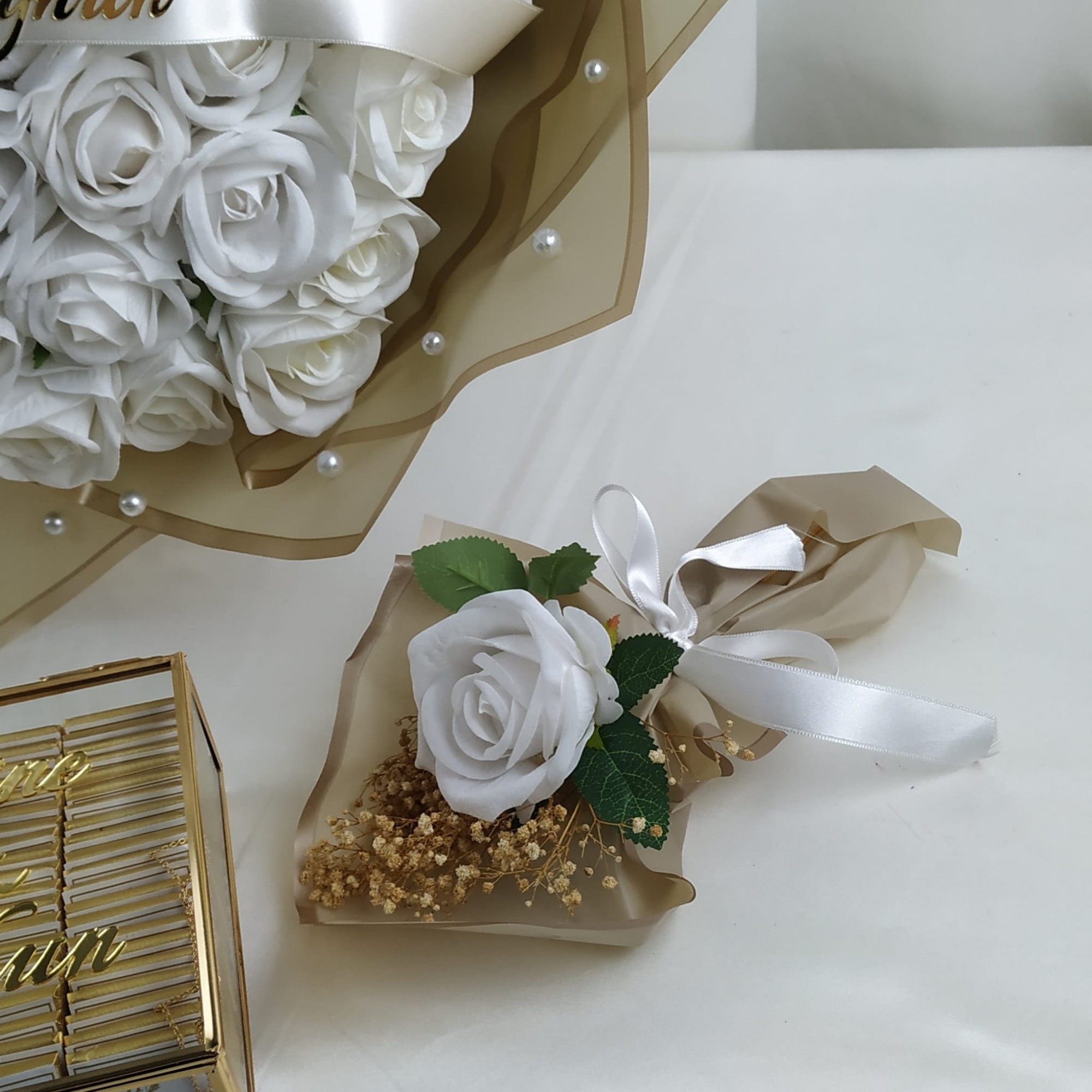 Nişan töreniniz için özenle hazırlanan buket ve nişan çikolatası seti, en özel gününüzü tamamlayan zarif bir detaydır.