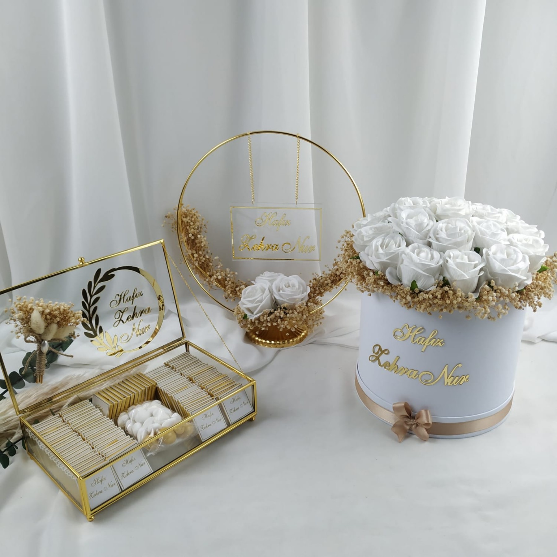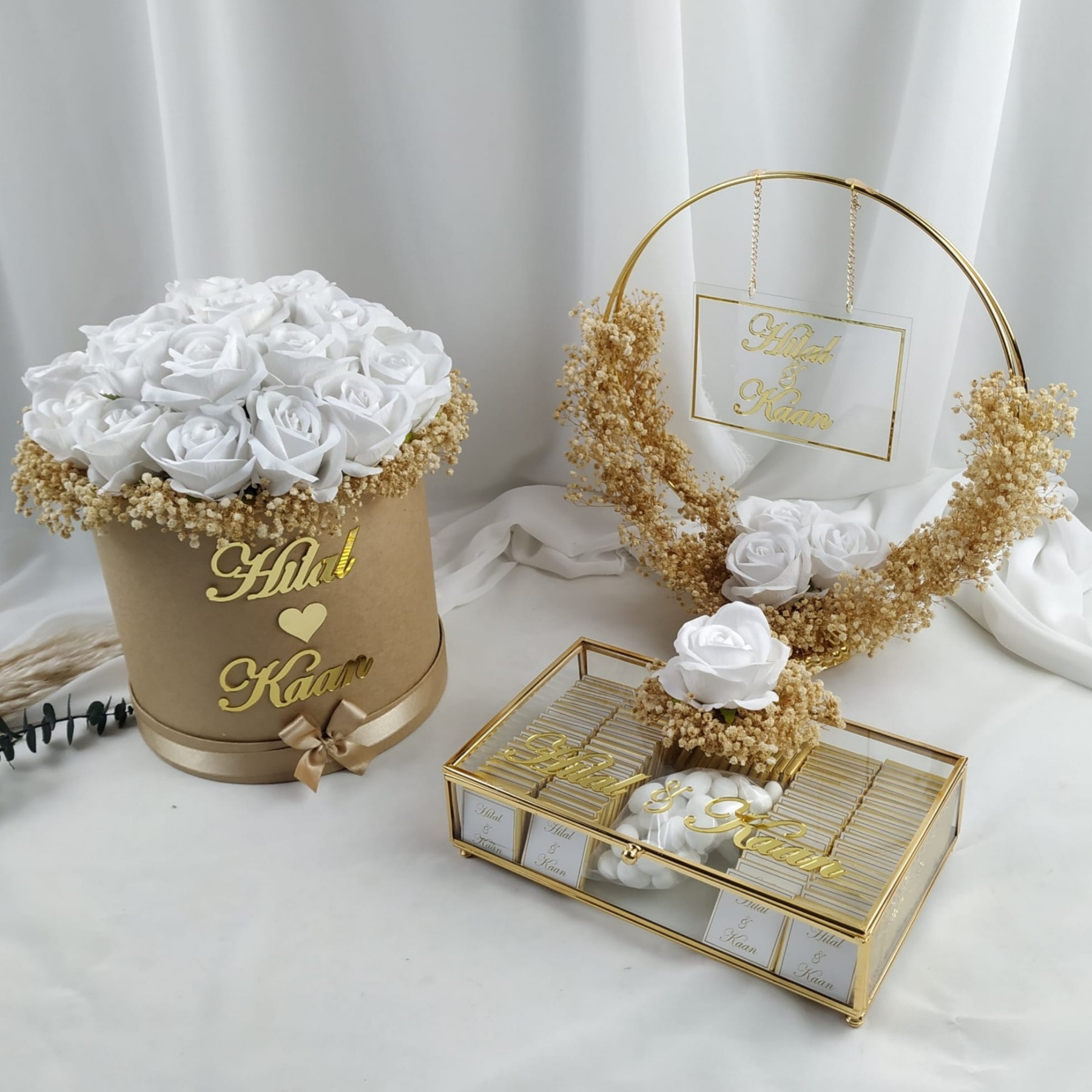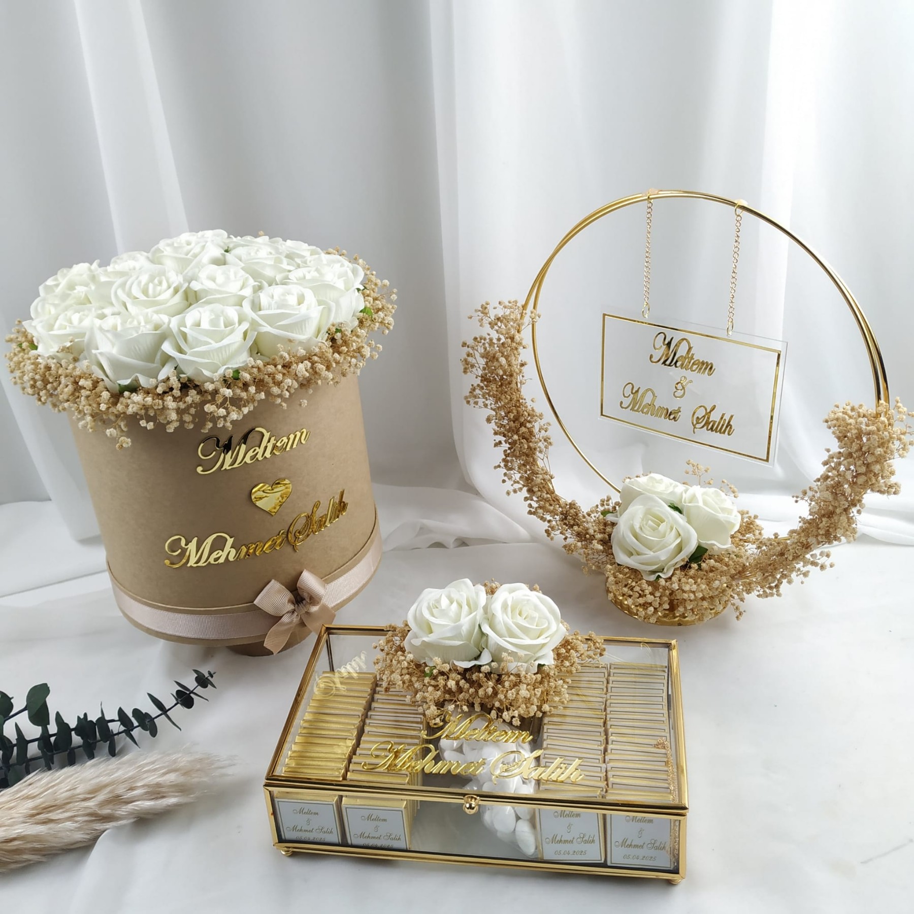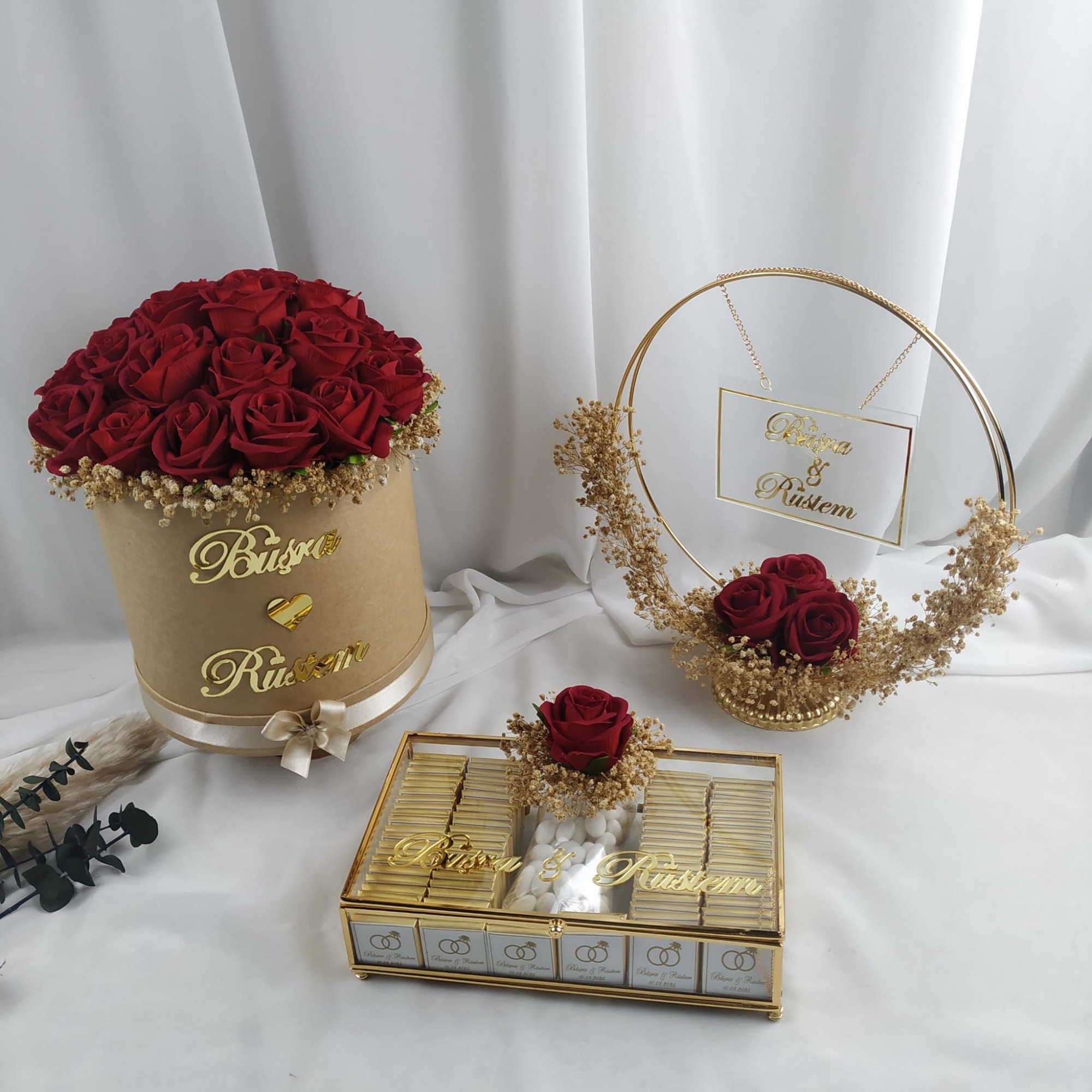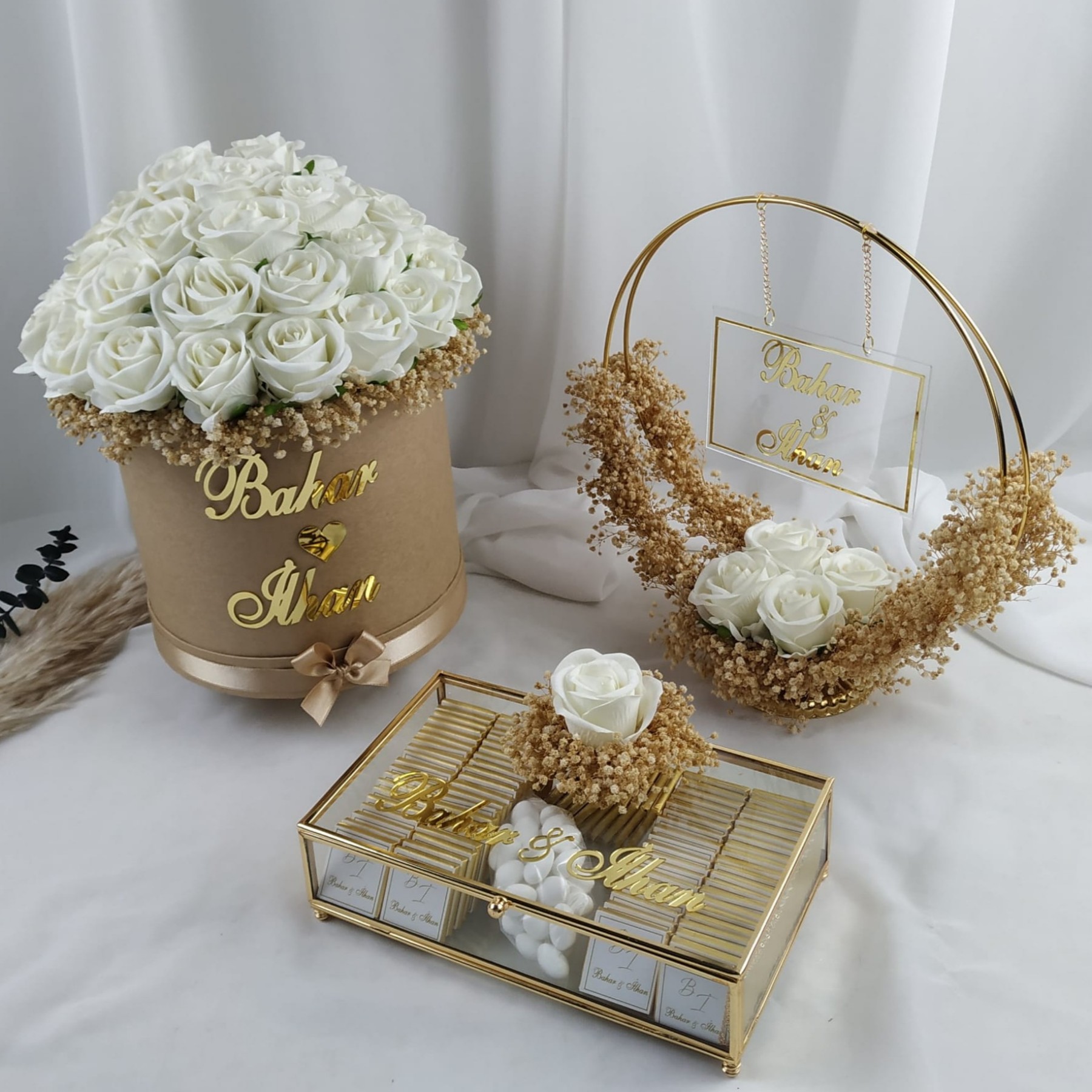 Nişan töreniniz için özenle hazırlanan isimlik, buket ve nişan çikolatası seti, en özel gününüzü tamamlayan zarif bir detaydır.
