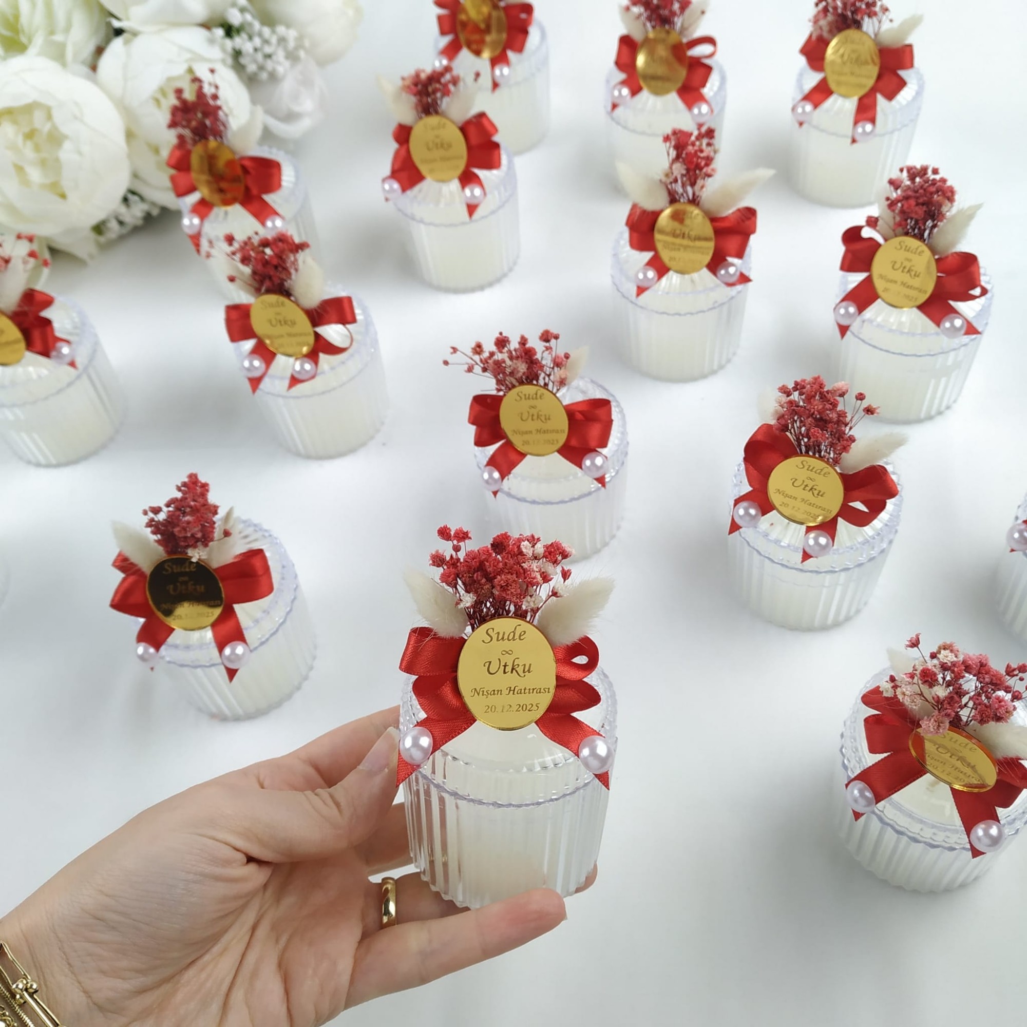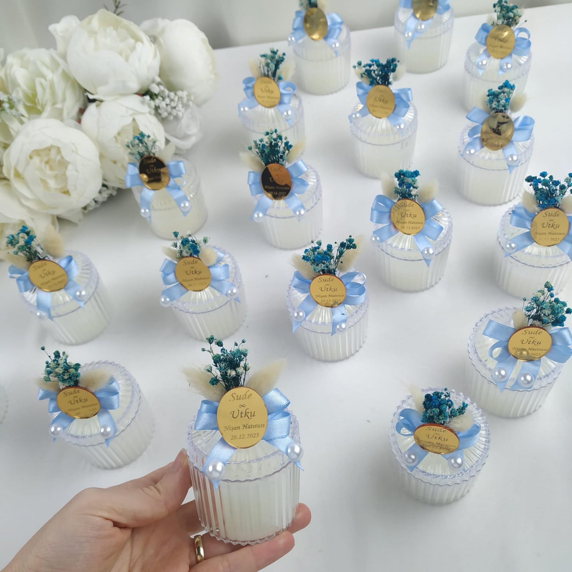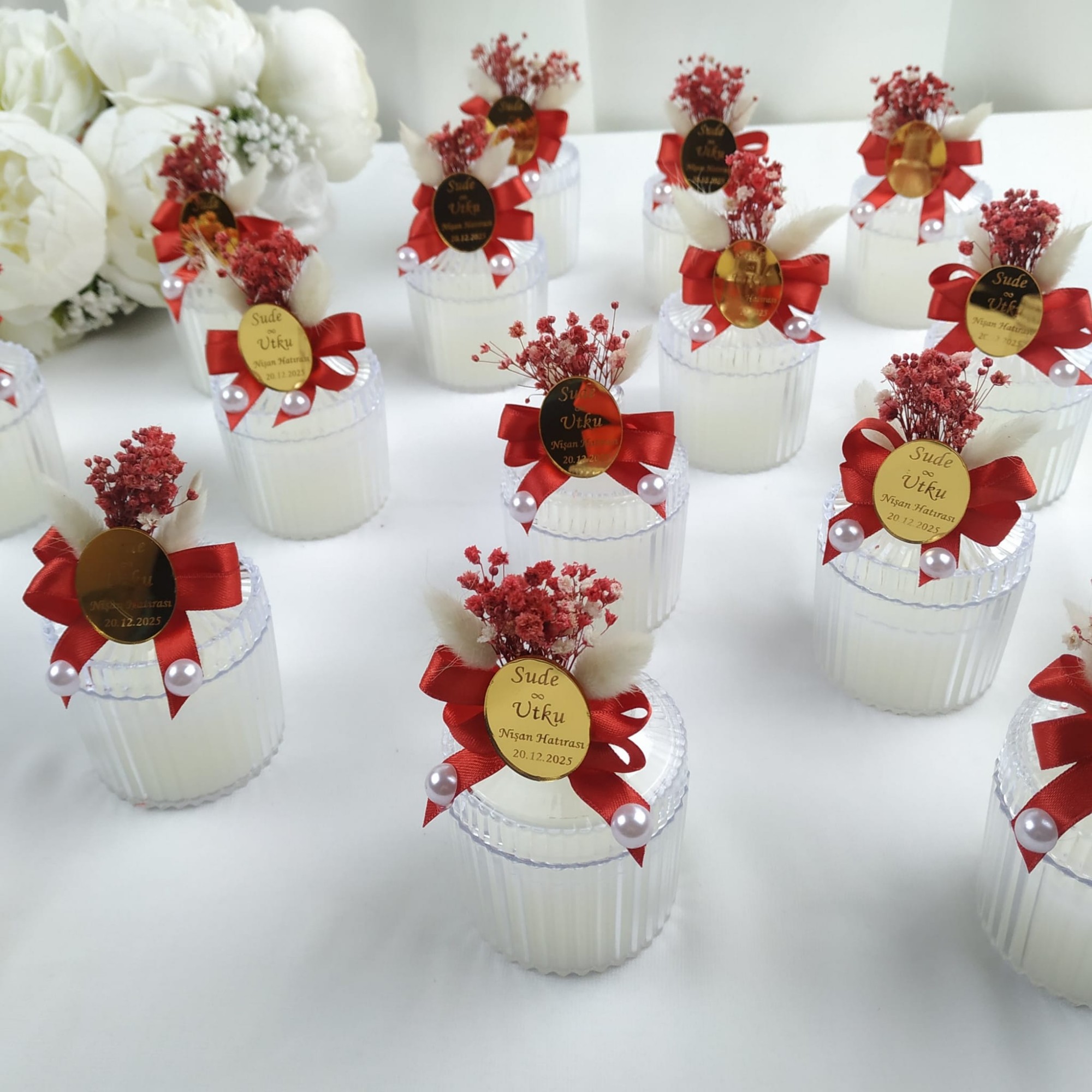 El emeğiyle hazırlanmış dekoratif çiçekli mum hediyelik, davetlileriniz için her biri özenle hazırlanmış ve kaliteli malzemelerle üretilmiştir.