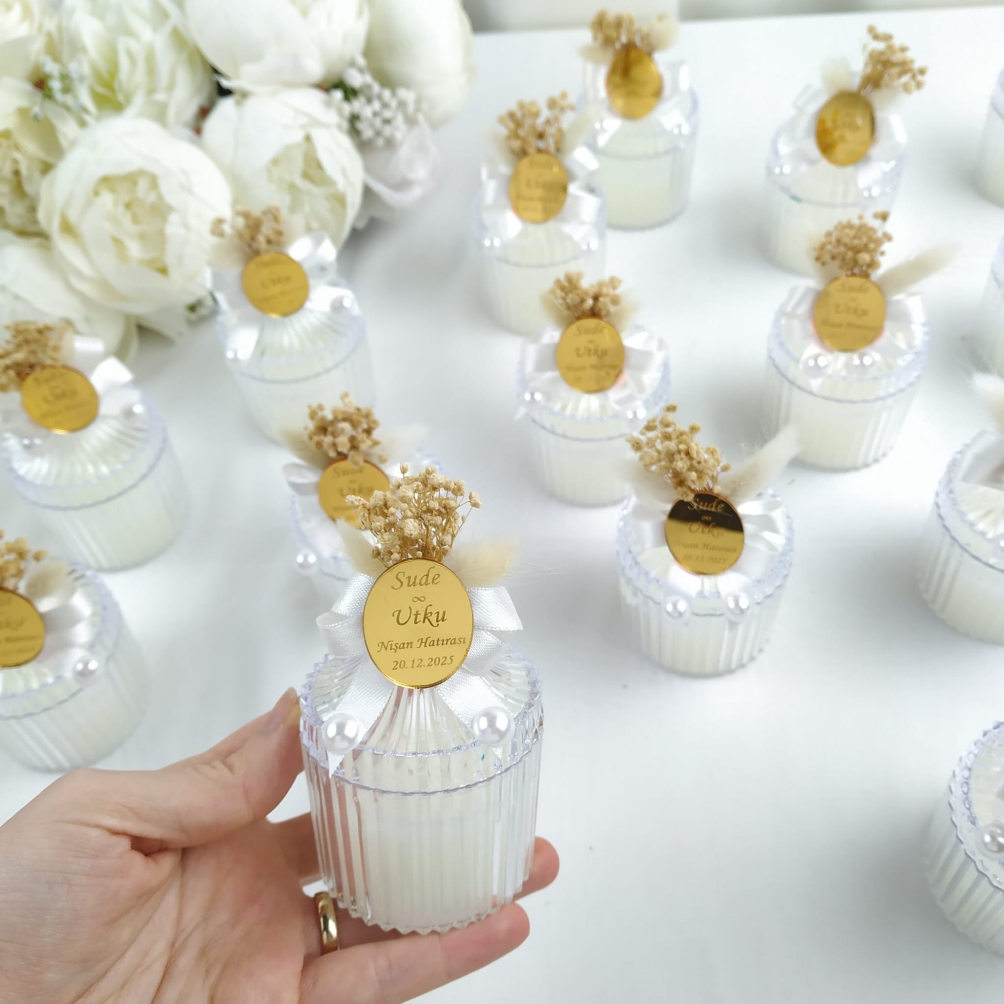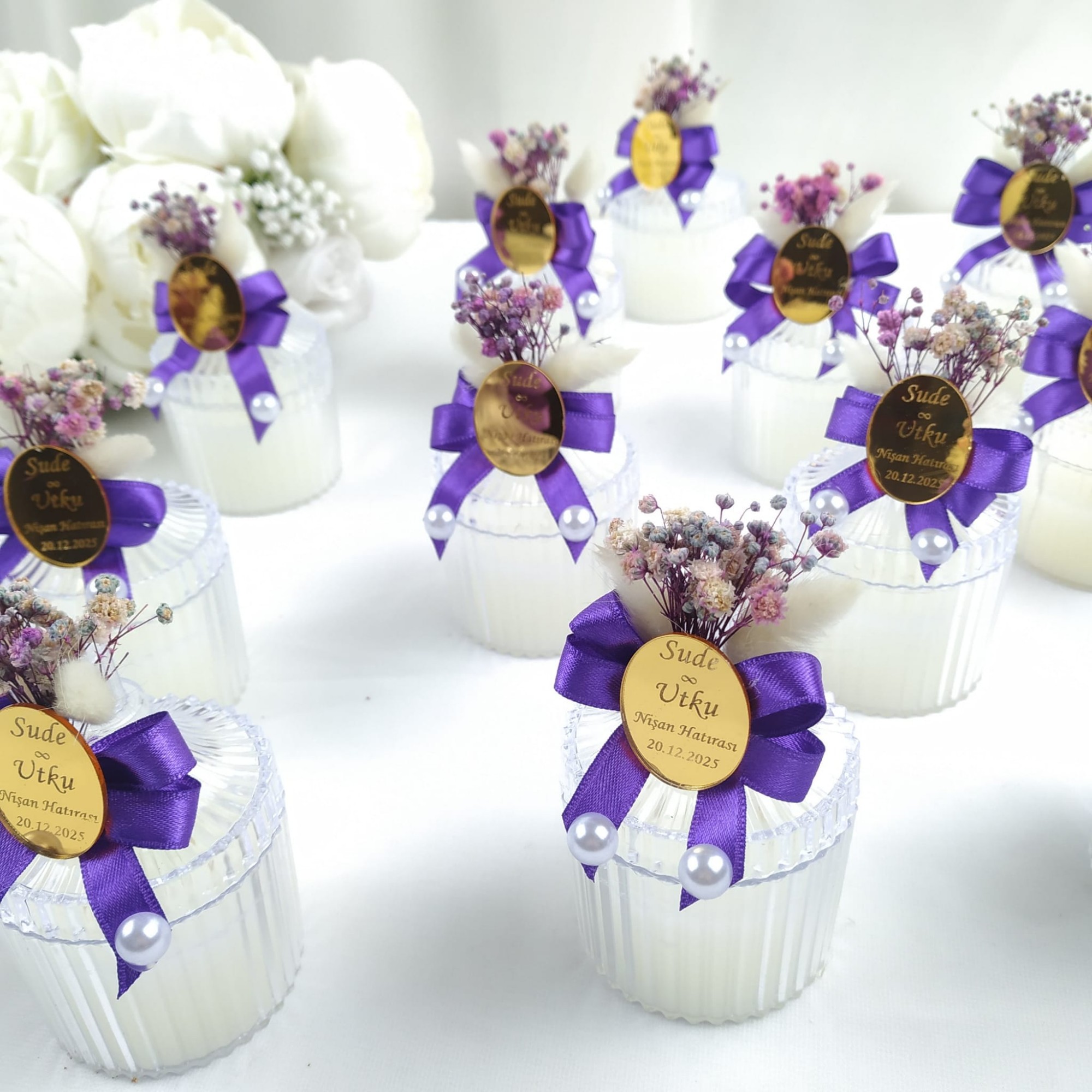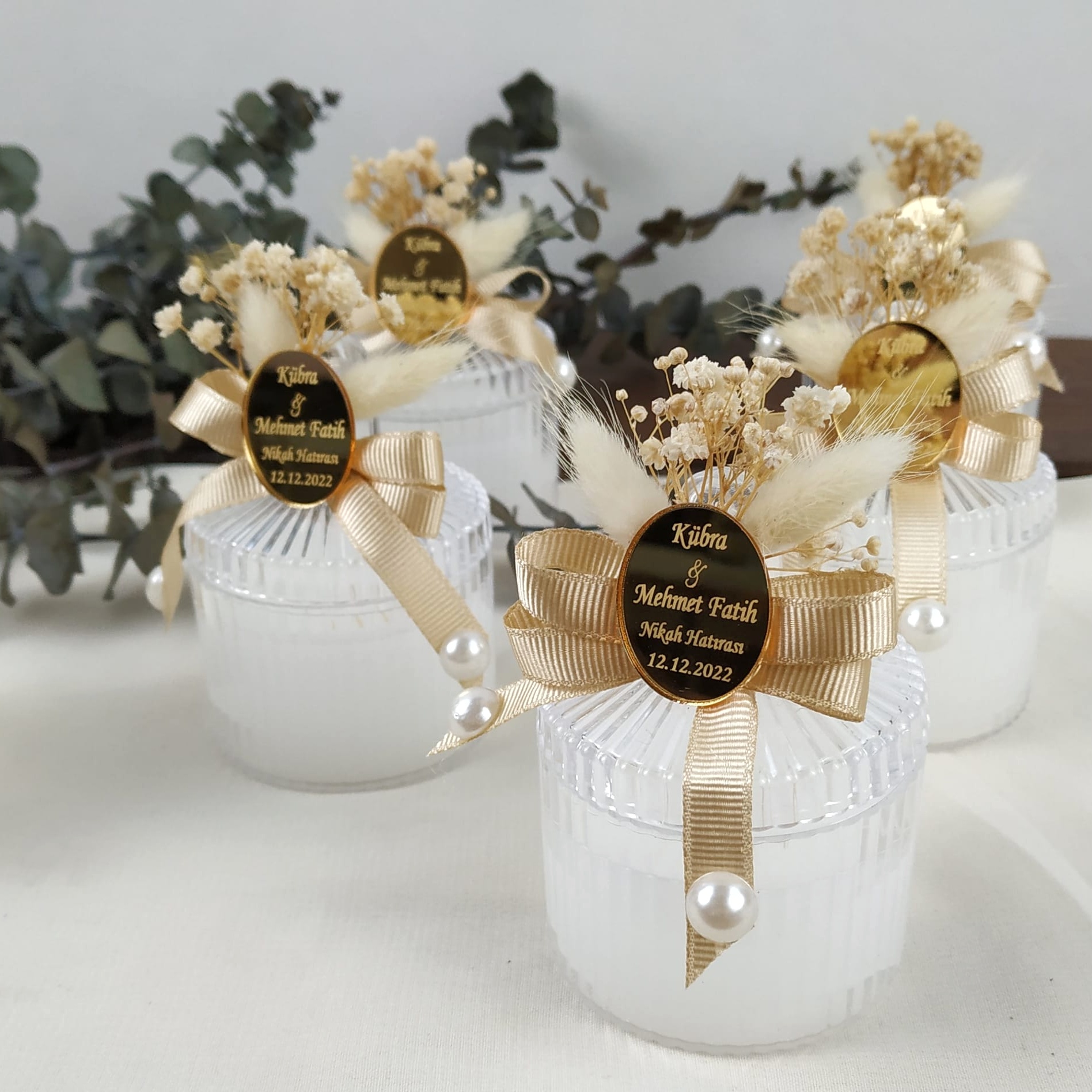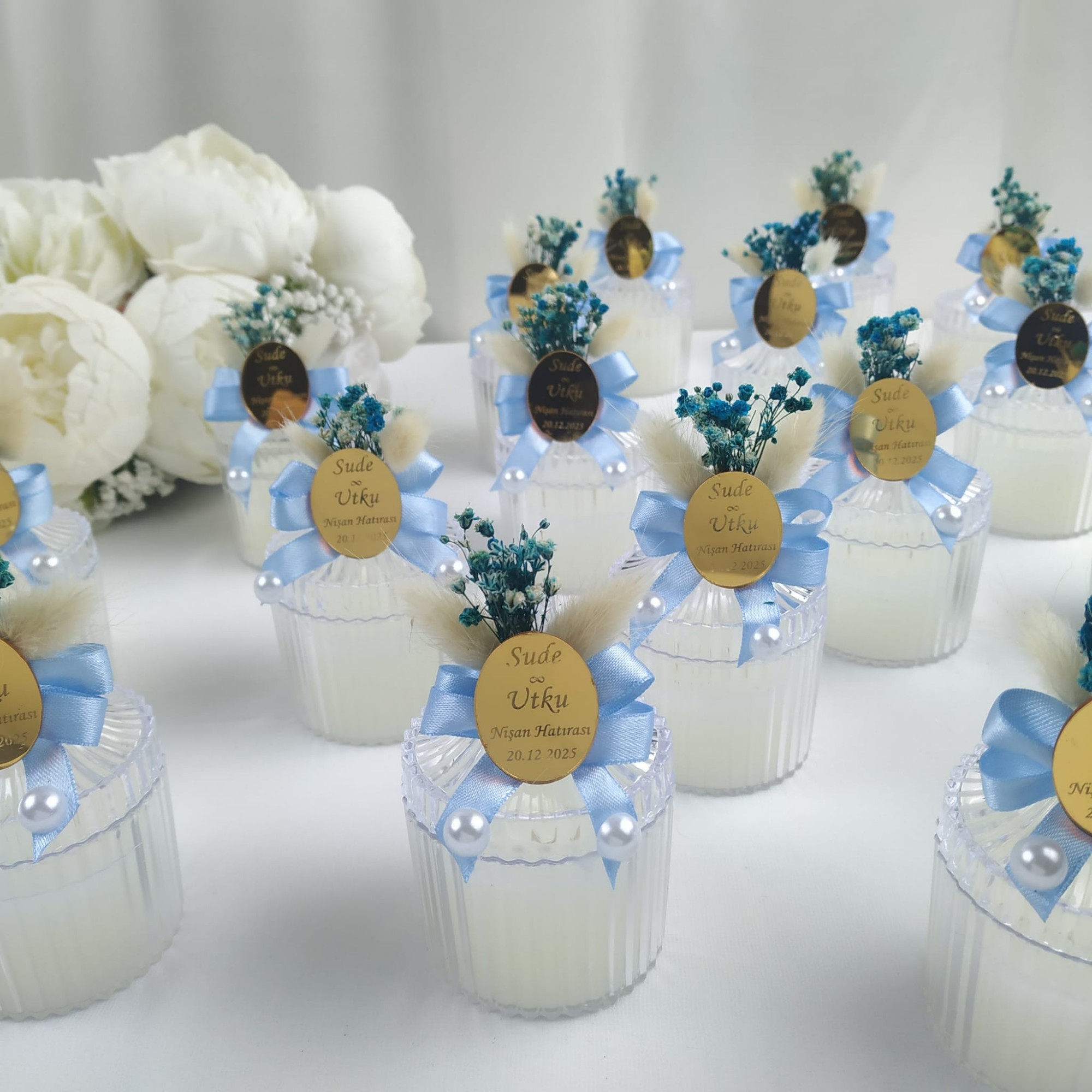 El emeğiyle hazırlanmış dekoratif çiçekli mum hediyelik, davetlileriniz için her biri özenle hazırlanmış ve kaliteli malzemelerle üretilmiştir.