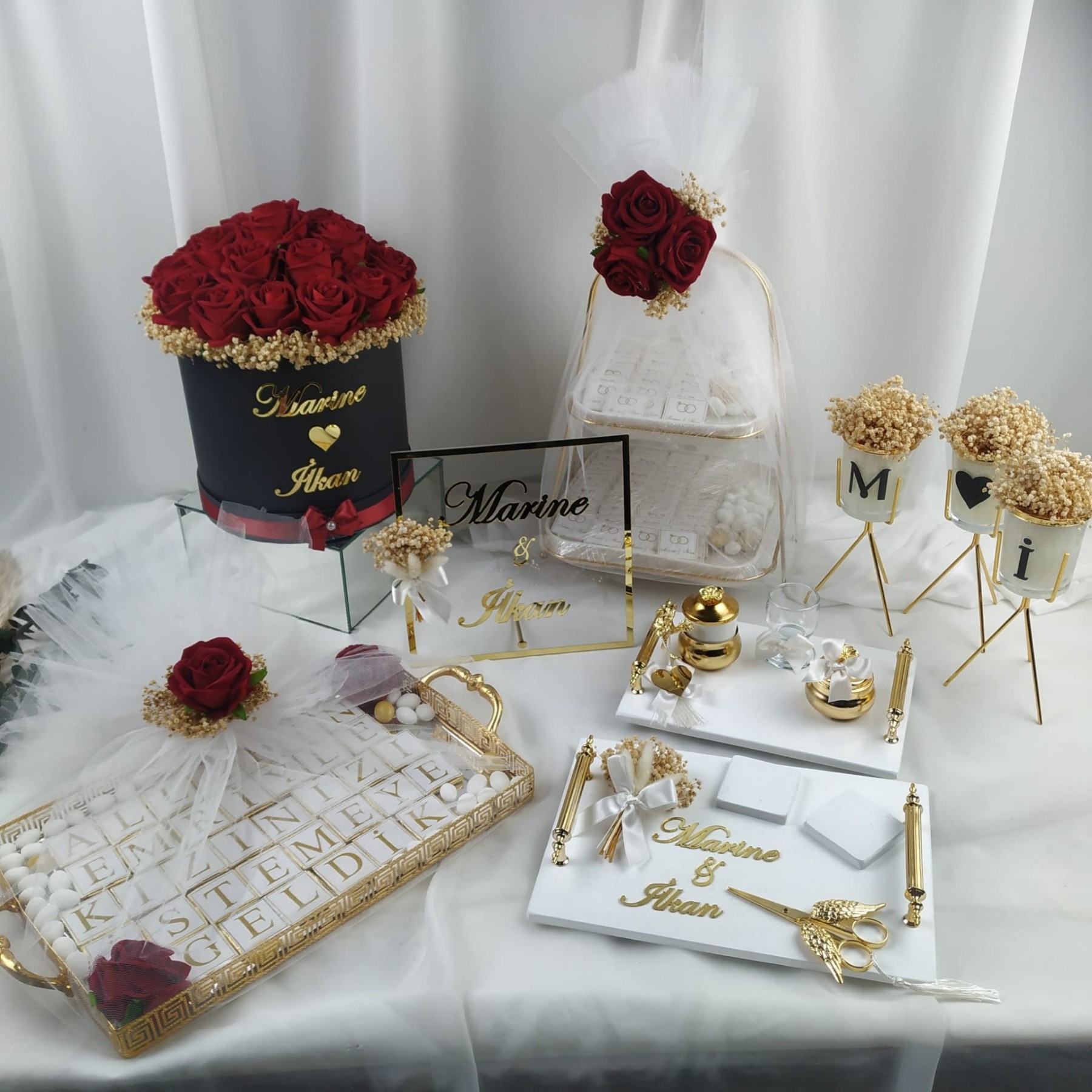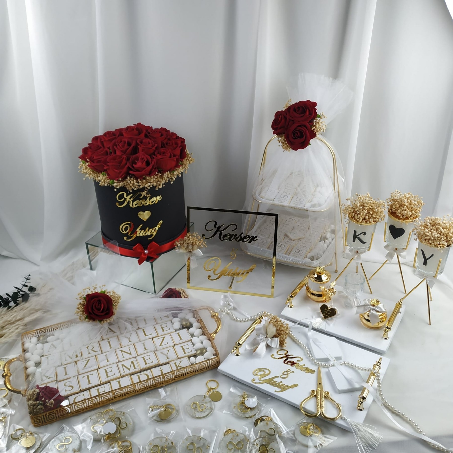 Epoksi Tepsi Seti, Kutuda Çiçek, Dekor Mumlar, Dekoratif İsimlik, Katlı Sunumluk Söz Nişan Çikolatası ve Dekoratif Tepsi Söz Nişan Çikolatası