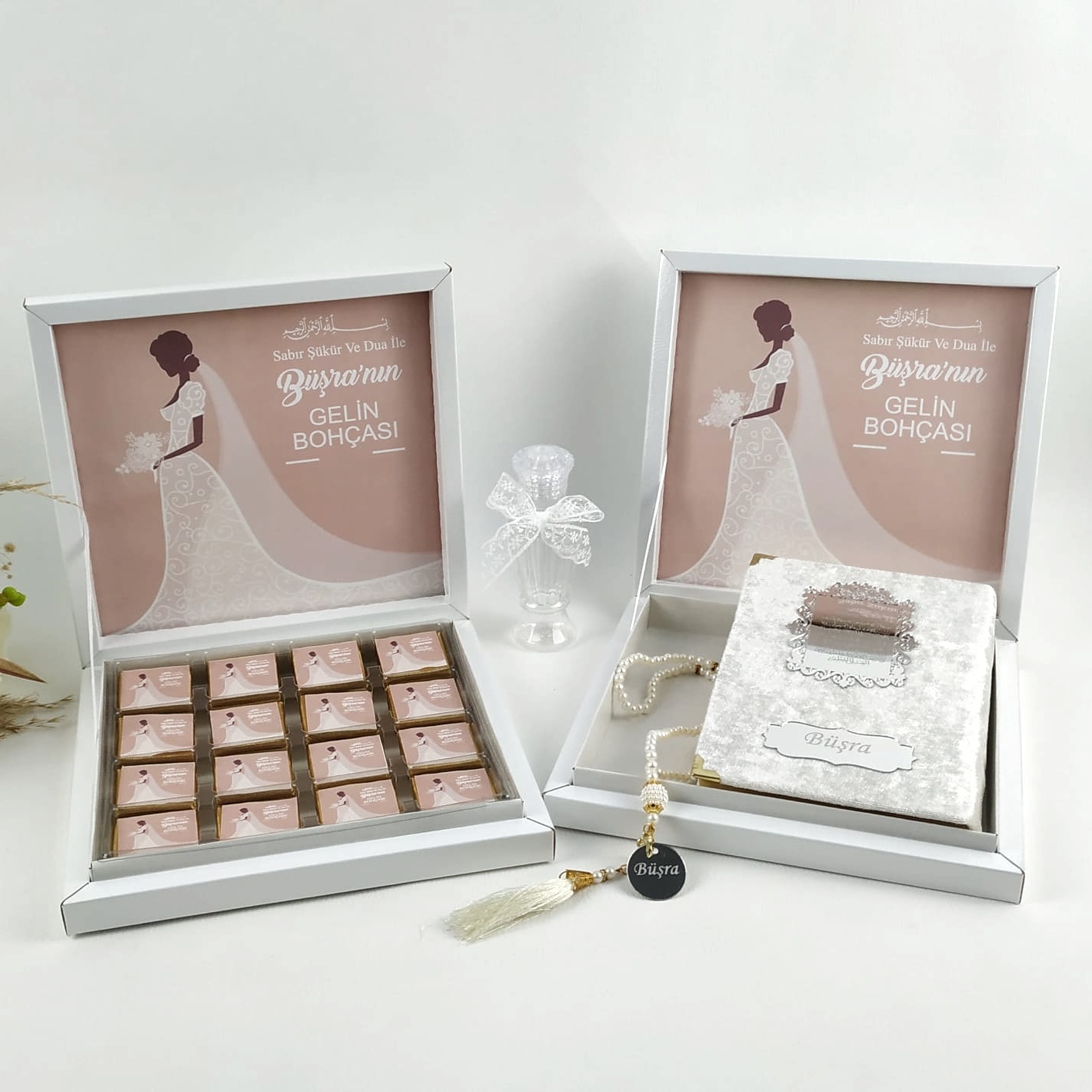 Kişiye özel hazırlanan Kur’an-ı Kerim ve çikolata seti, en özel gününüzü tamamlayan zarif bir detaydır.
