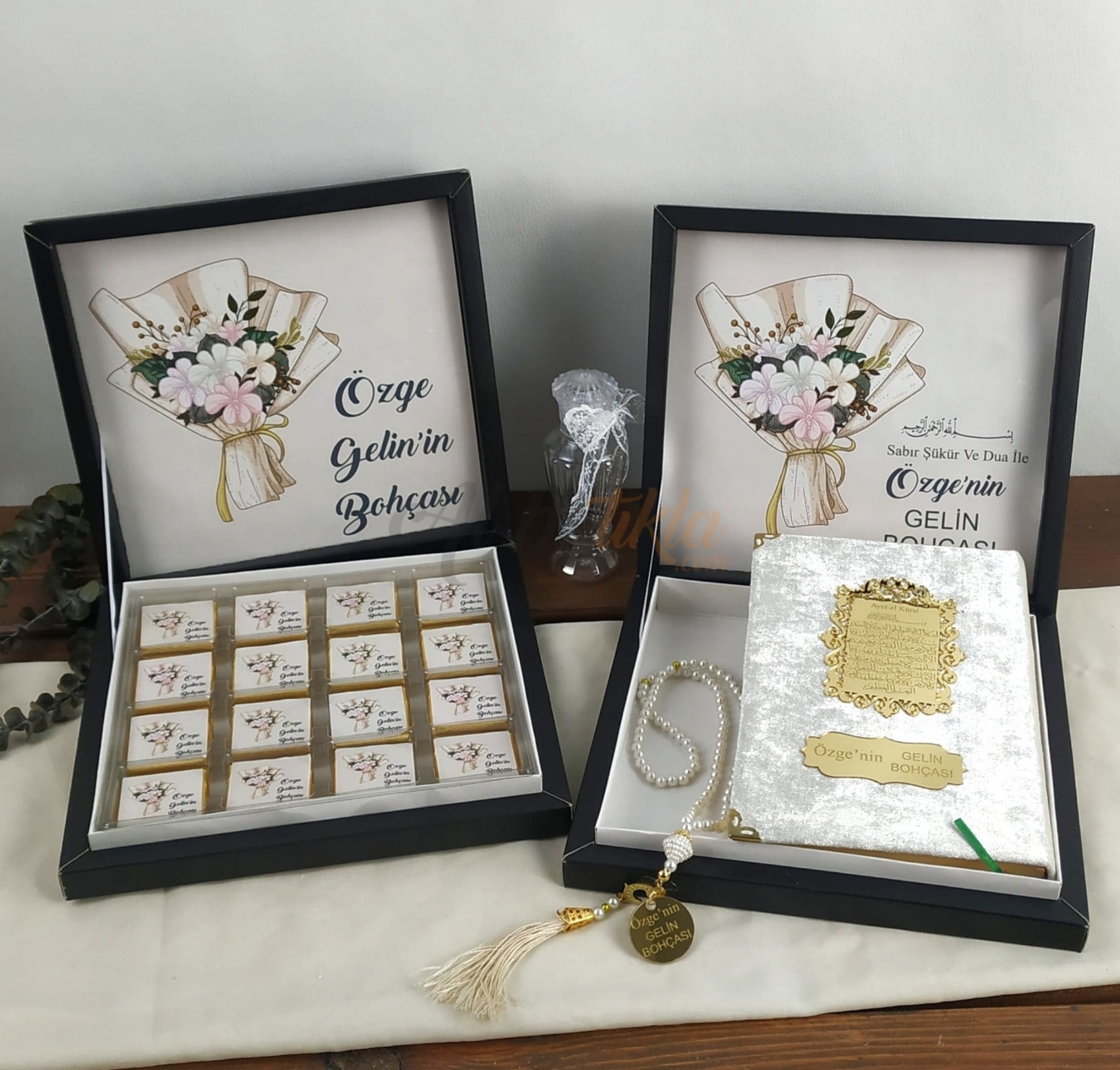 Kişiye özel hazırlanan Kur’an-ı Kerim ve çikolata seti, en özel gününüzü tamamlayan zarif bir detaydır.