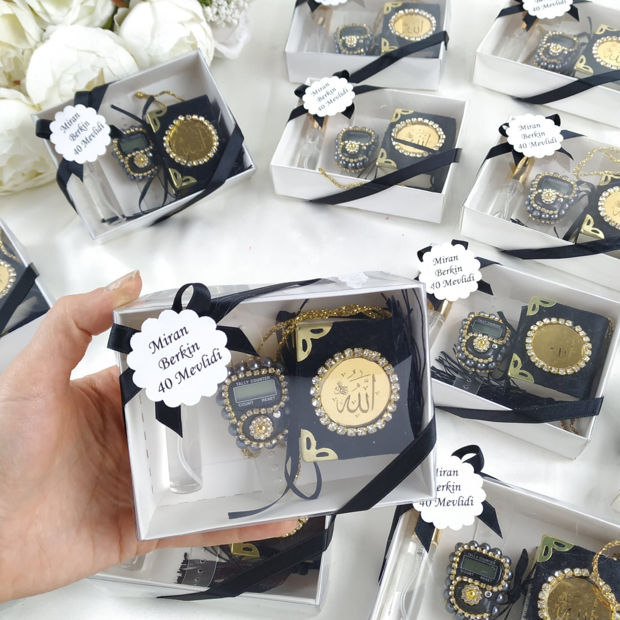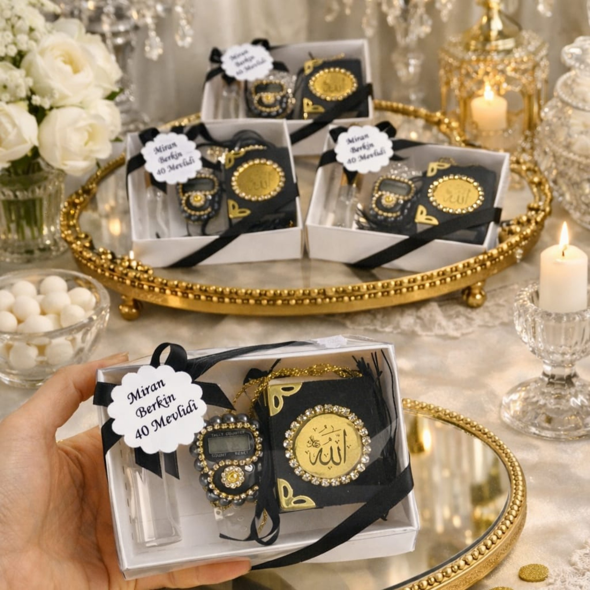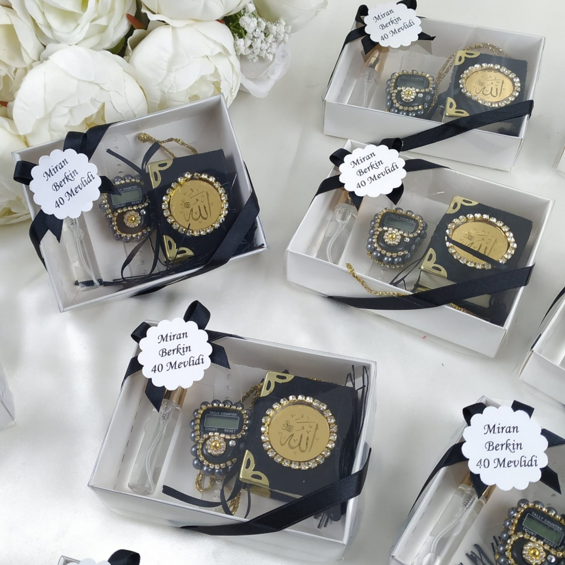 El emeğiyle hazırlanmış zikirmatik, sprey kolonya ve Kur’an-ı Kerim hediyelik, davetlileriniz için her biri özenle hazırlanmış ve kaliteli malzemelerle üretilmiştir.