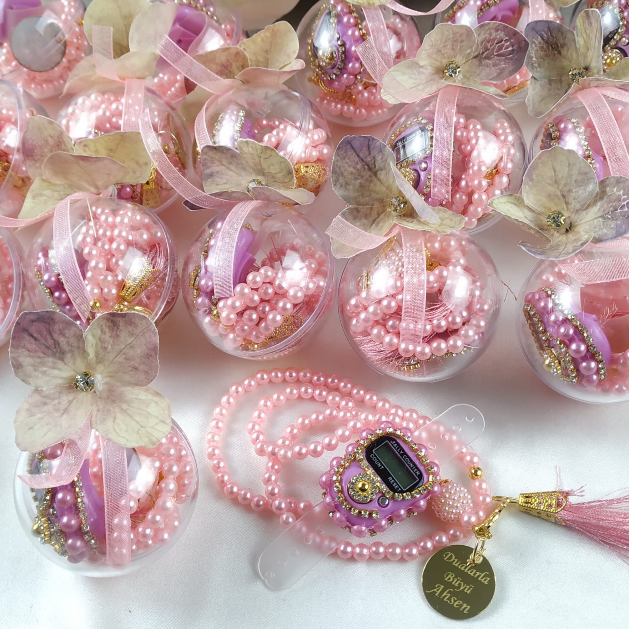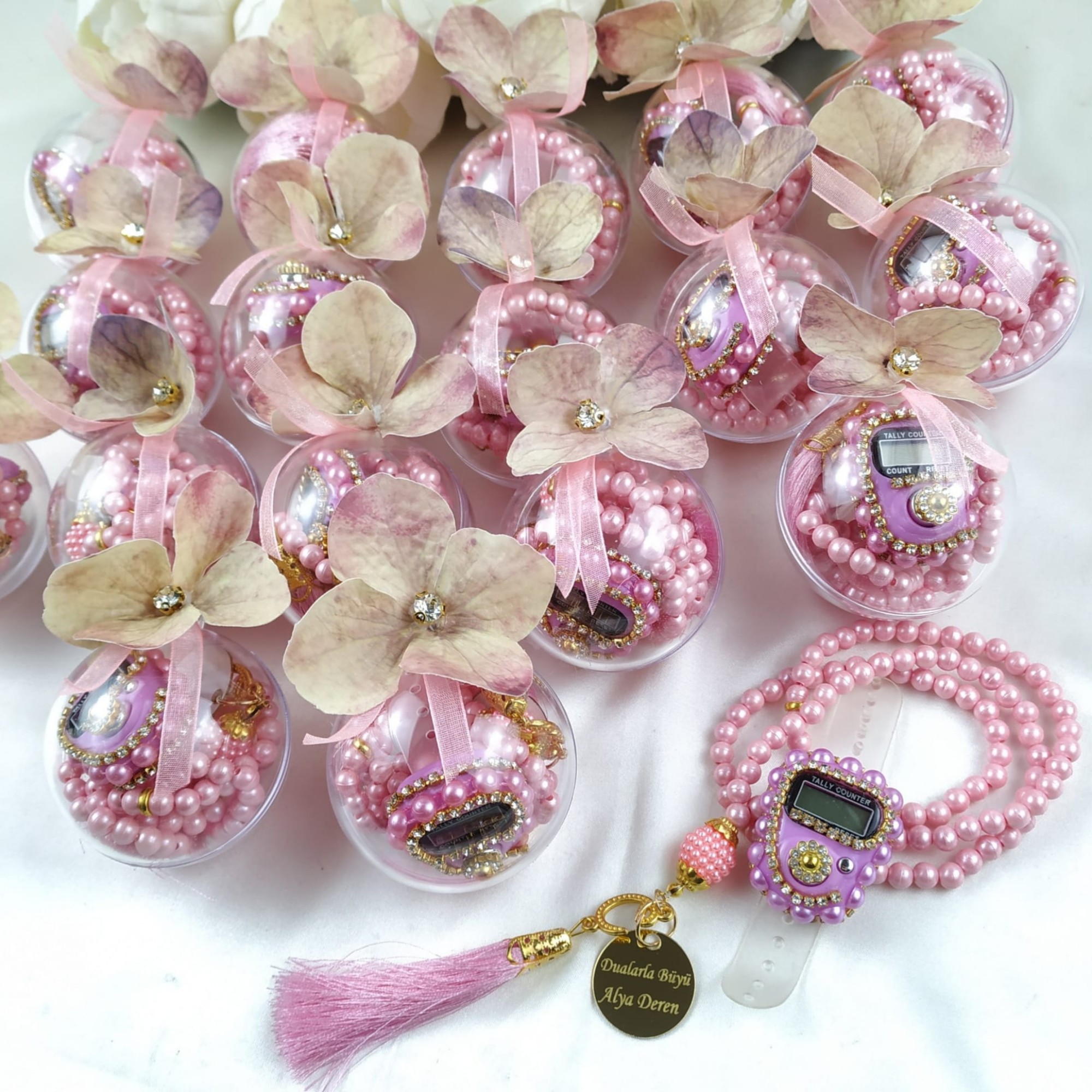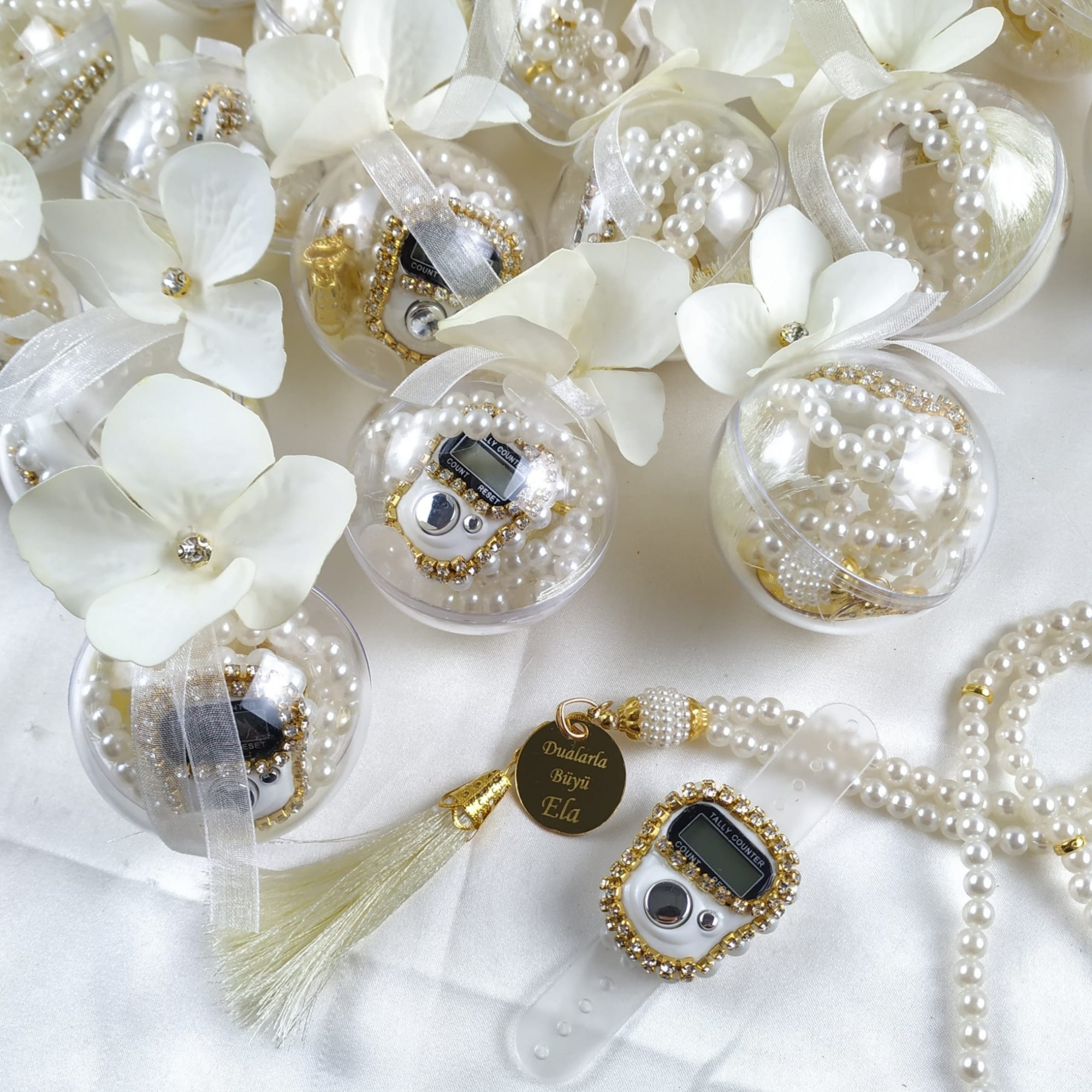 El emeğiyle hazırlanmış küre içinde tespih ve zikirmatik hediyelik, davetlileriniz için her biri özenle hazırlanmış ve kaliteli malzemelerle üretilmiştir.