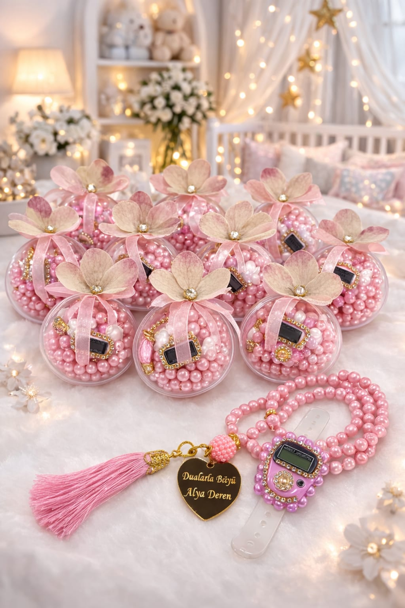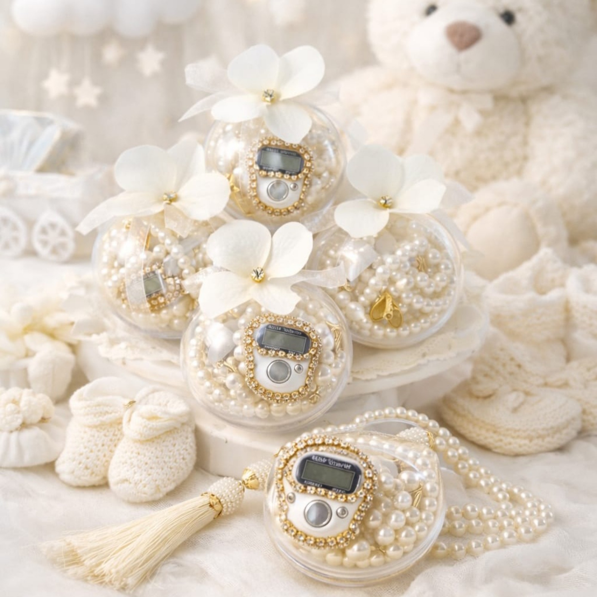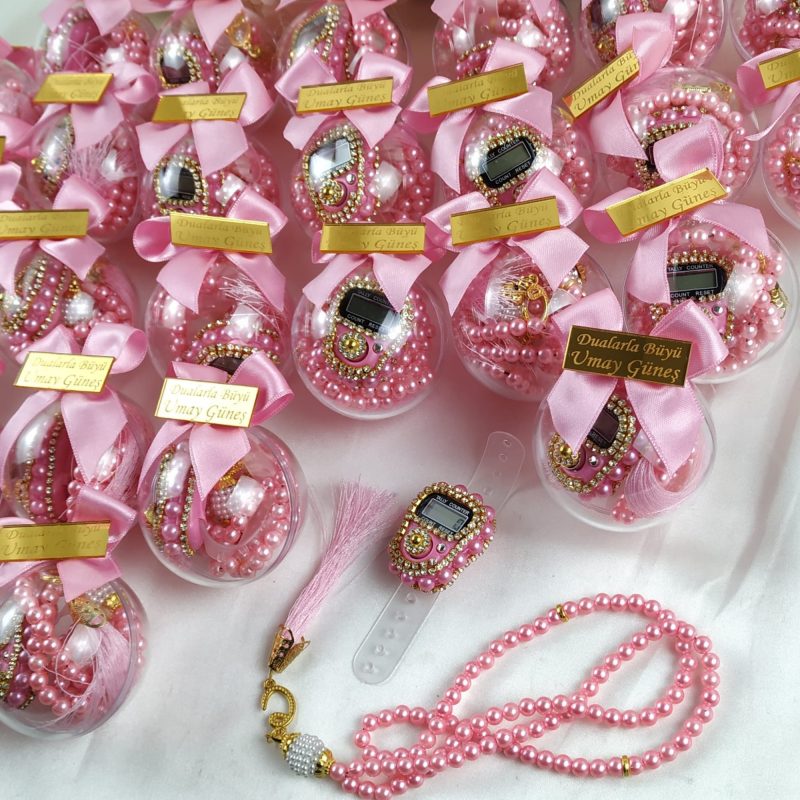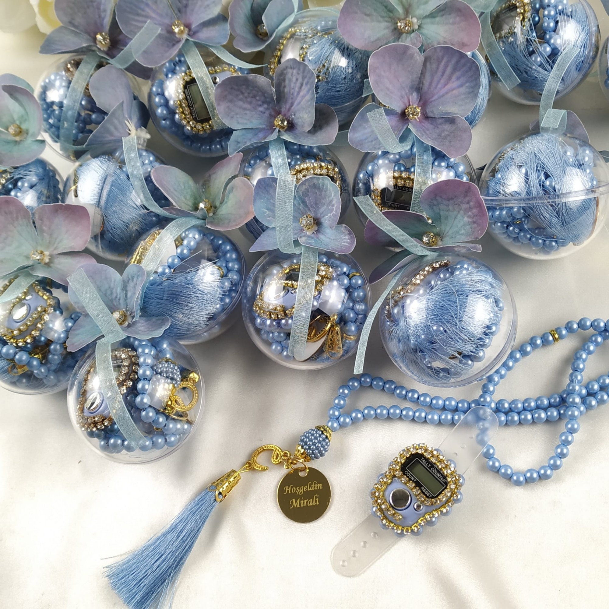 El emeğiyle hazırlanmış küre içinde tespih ve zikirmatik hediyelik, davetlileriniz için her biri özenle hazırlanmış ve kaliteli malzemelerle üretilmiştir.