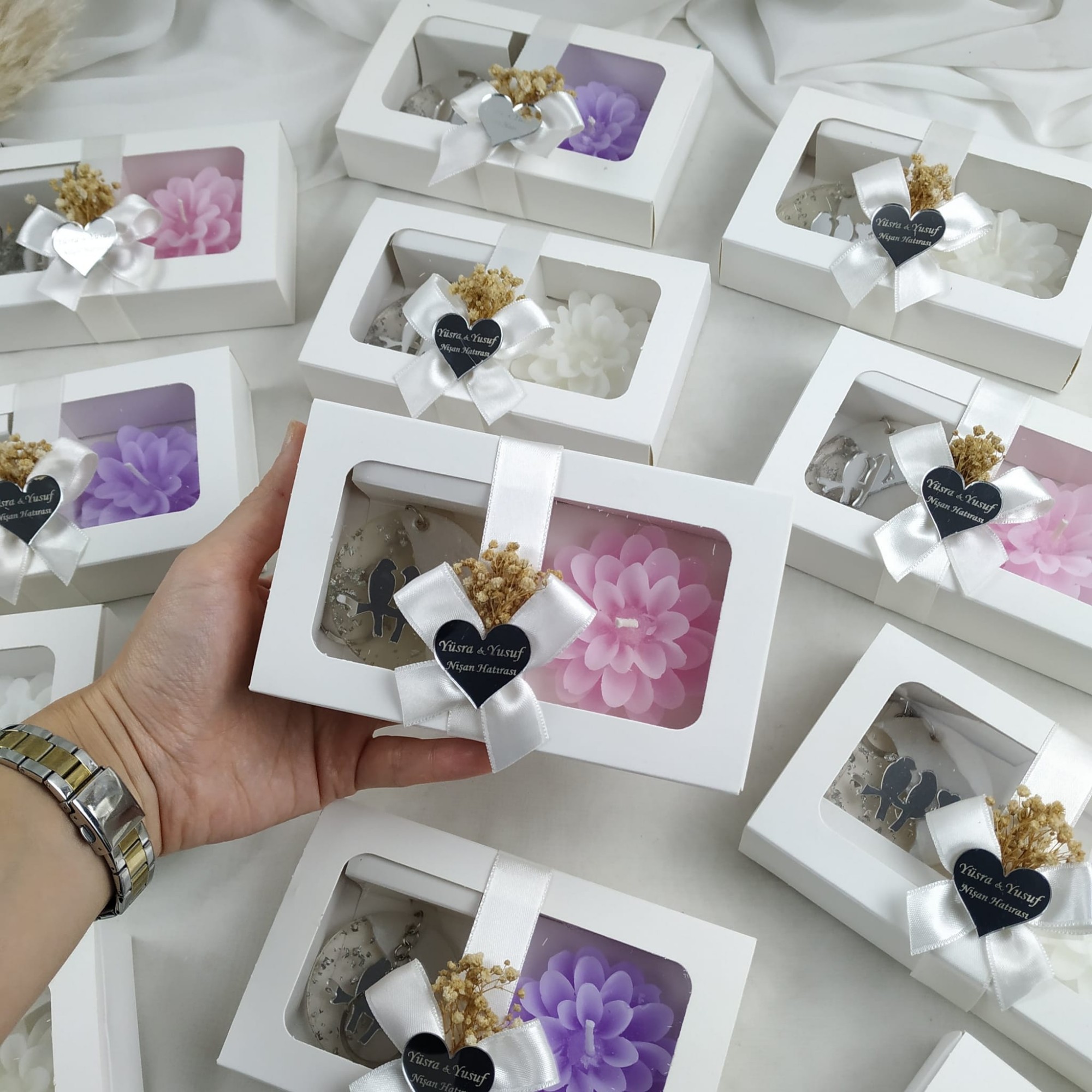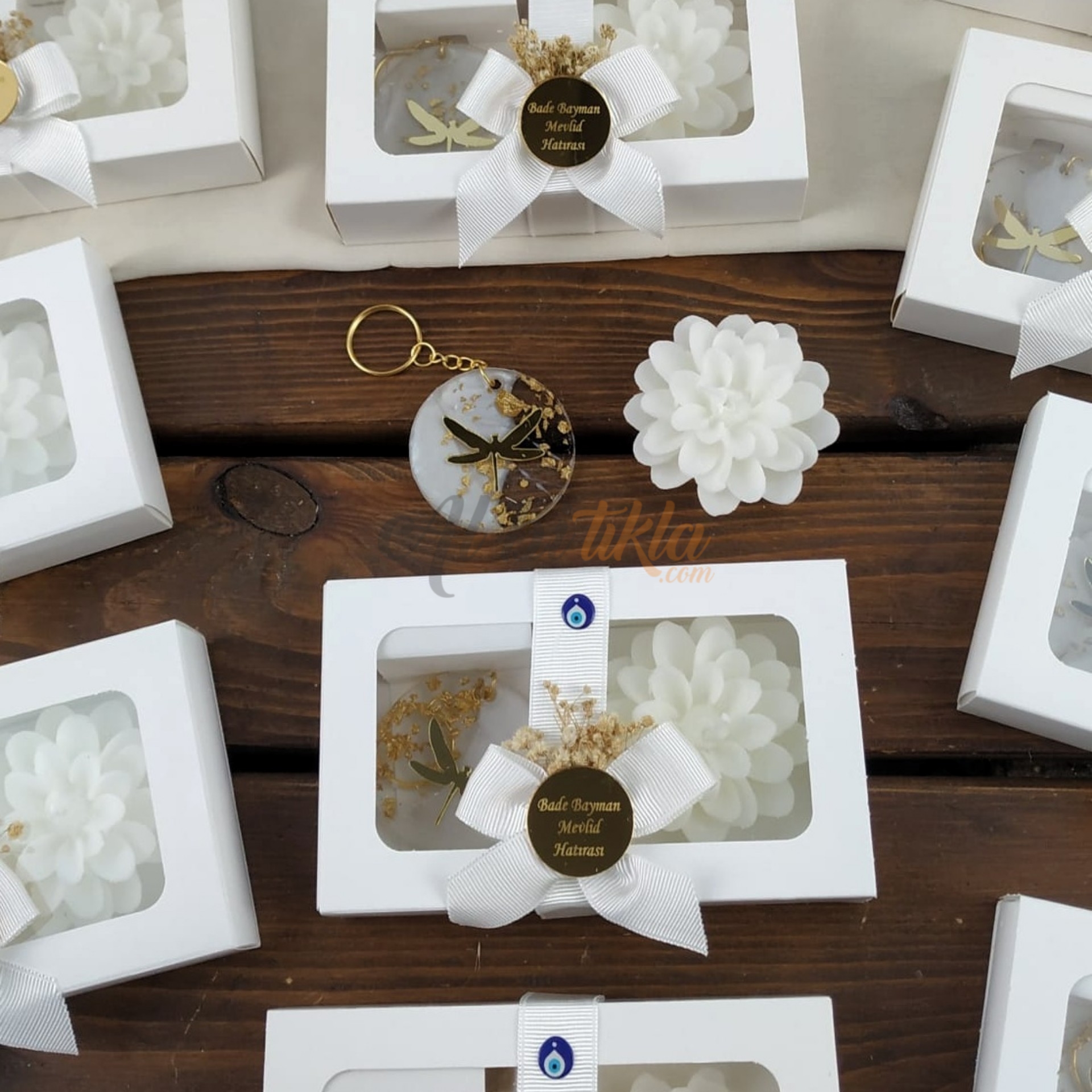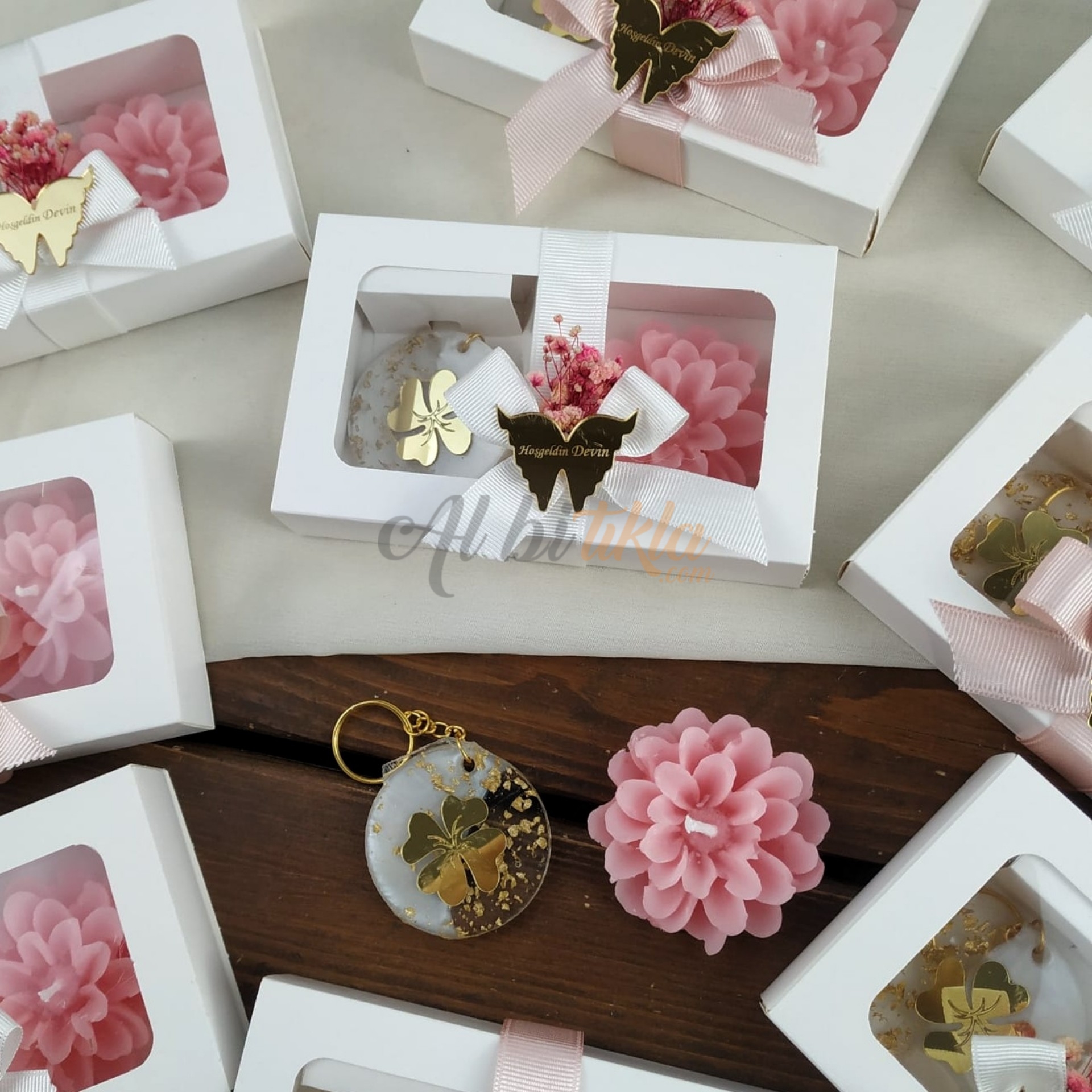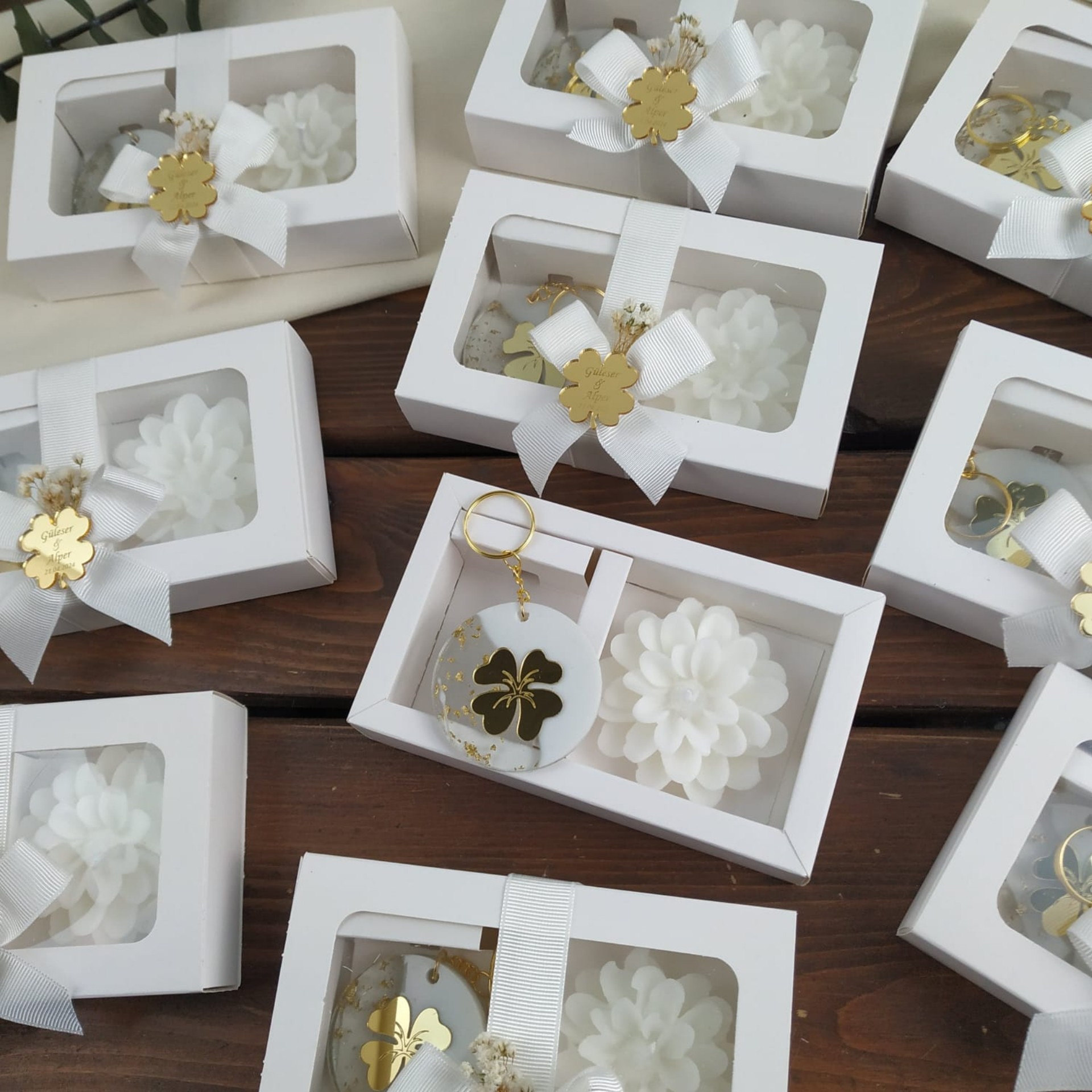 El emeğiyle hazırlanmış dekoratif lotus mum ve epoksi anahtarlık hediyelik, davetlileriniz için her biri özenle hazırlanmış ve kaliteli malzemelerle üretilmiştir.