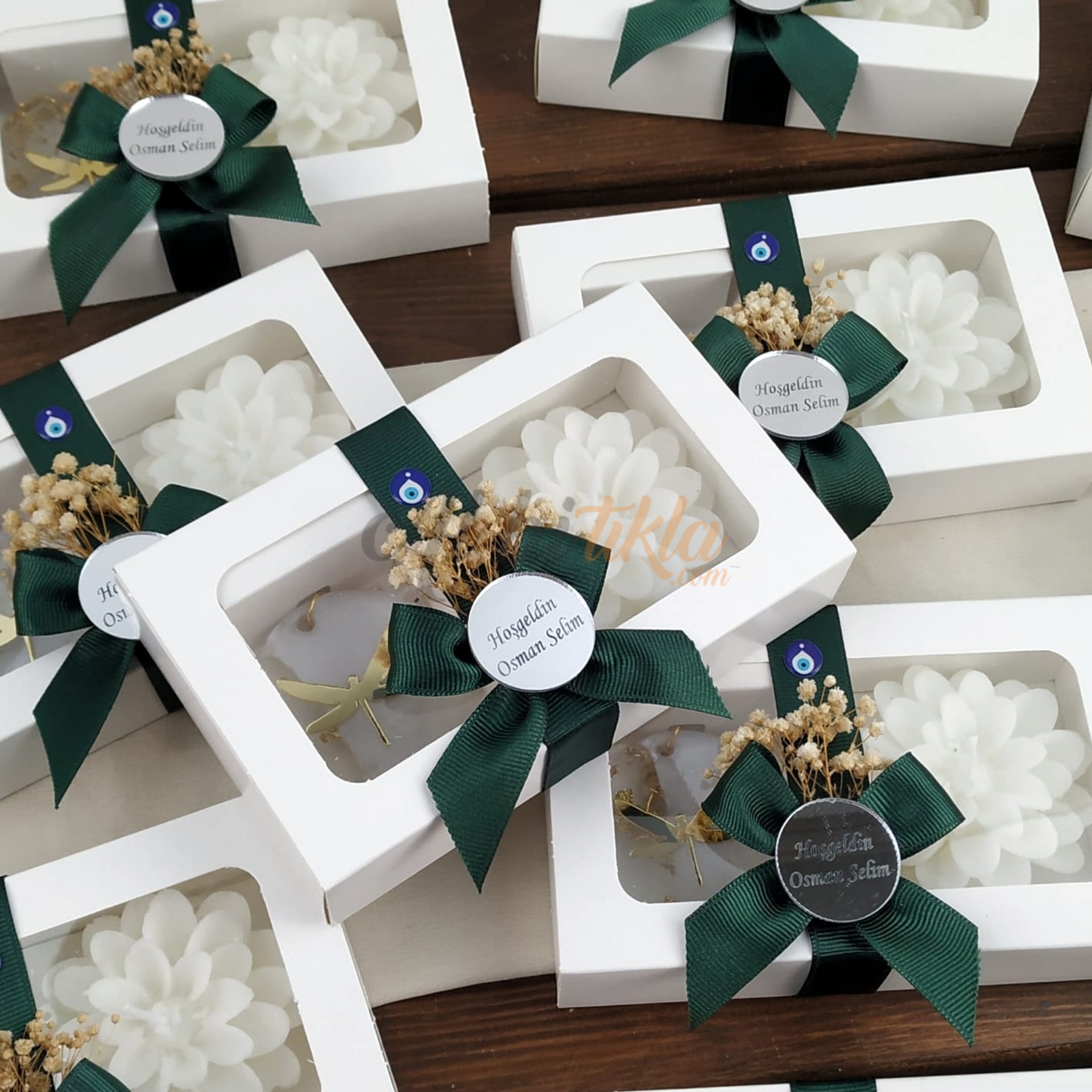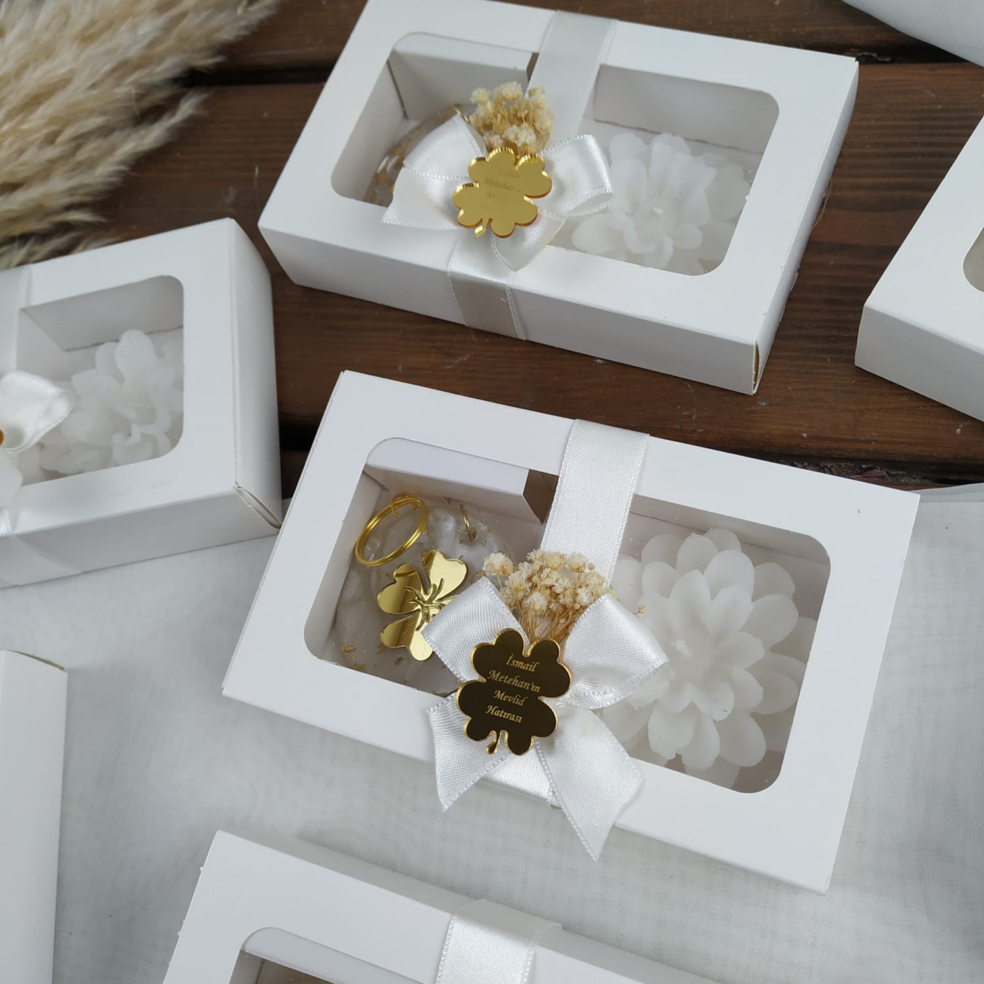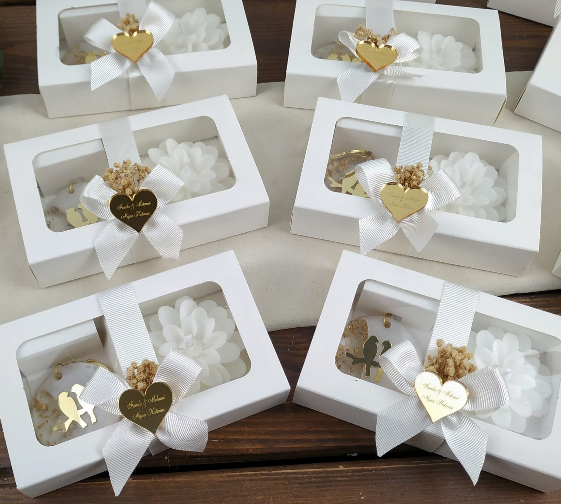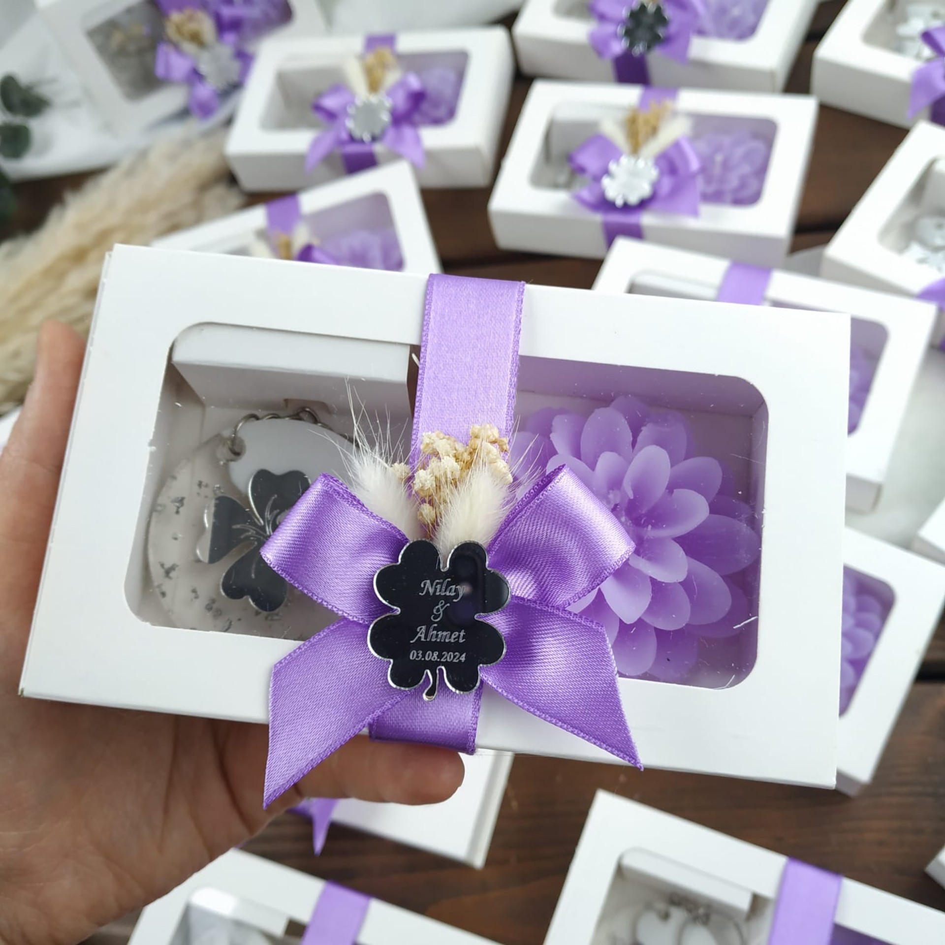 El emeğiyle hazırlanmış dekoratif lotus mum ve epoksi anahtarlık hediyelik, davetlileriniz için her biri özenle hazırlanmış ve kaliteli malzemelerle üretilmiştir.
