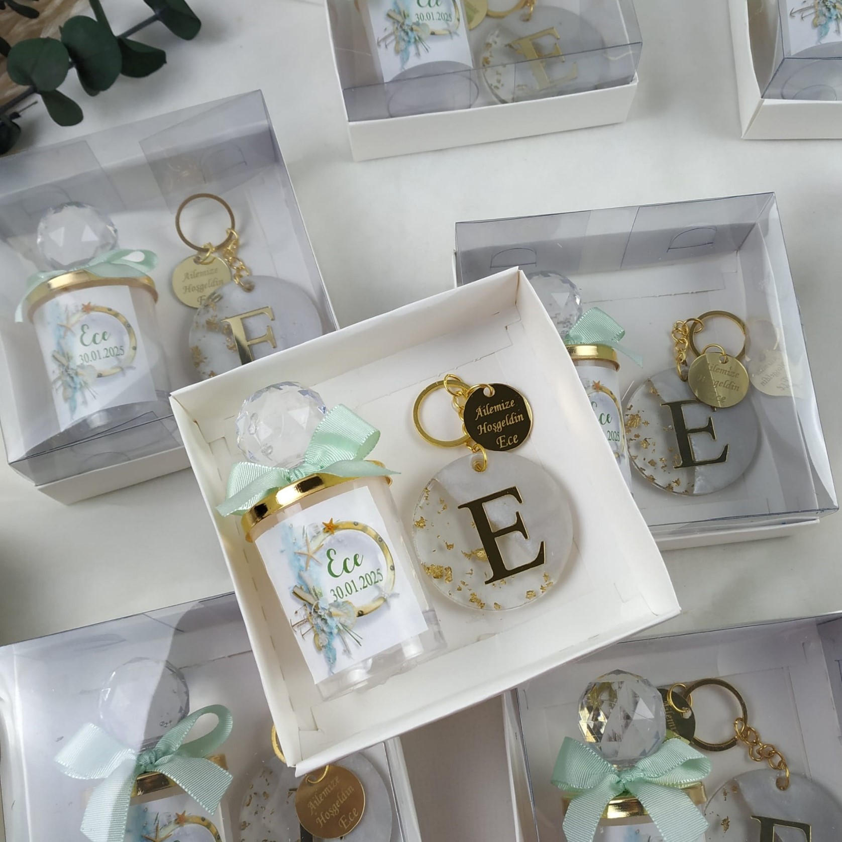 El emeğiyle hazırlanmış epoksi anahtarlık ve mum hediyelik, davetlileriniz için her biri özenle hazırlanmış ve kaliteli malzemelerle üretilmiştir.