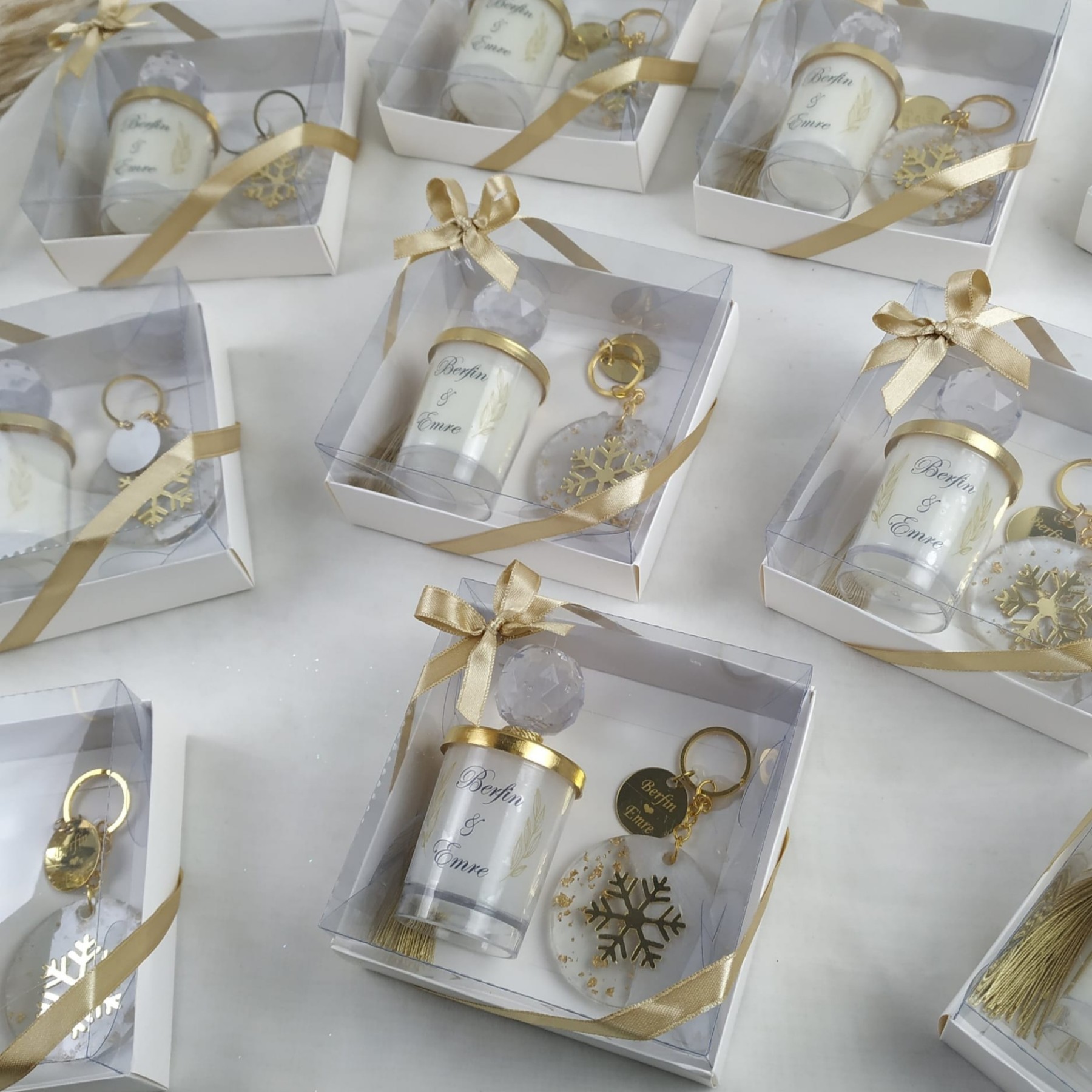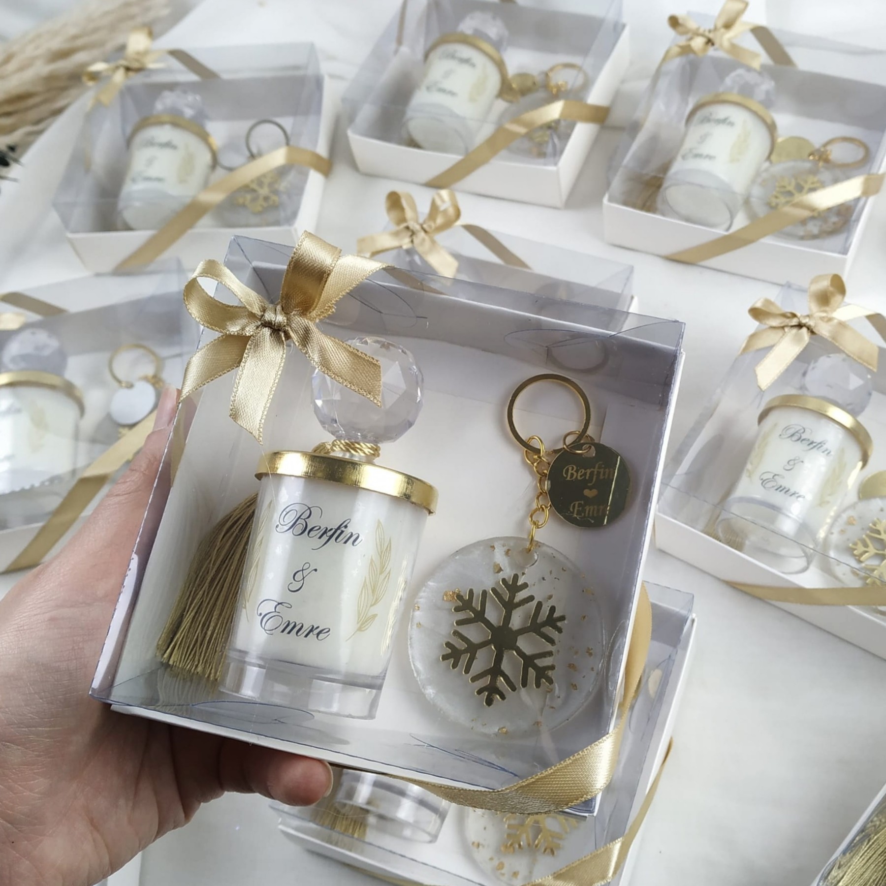 El emeğiyle hazırlanmış epoksi anahtarlık ve mum hediyelik, davetlileriniz için her biri özenle hazırlanmış ve kaliteli malzemelerle üretilmiştir.