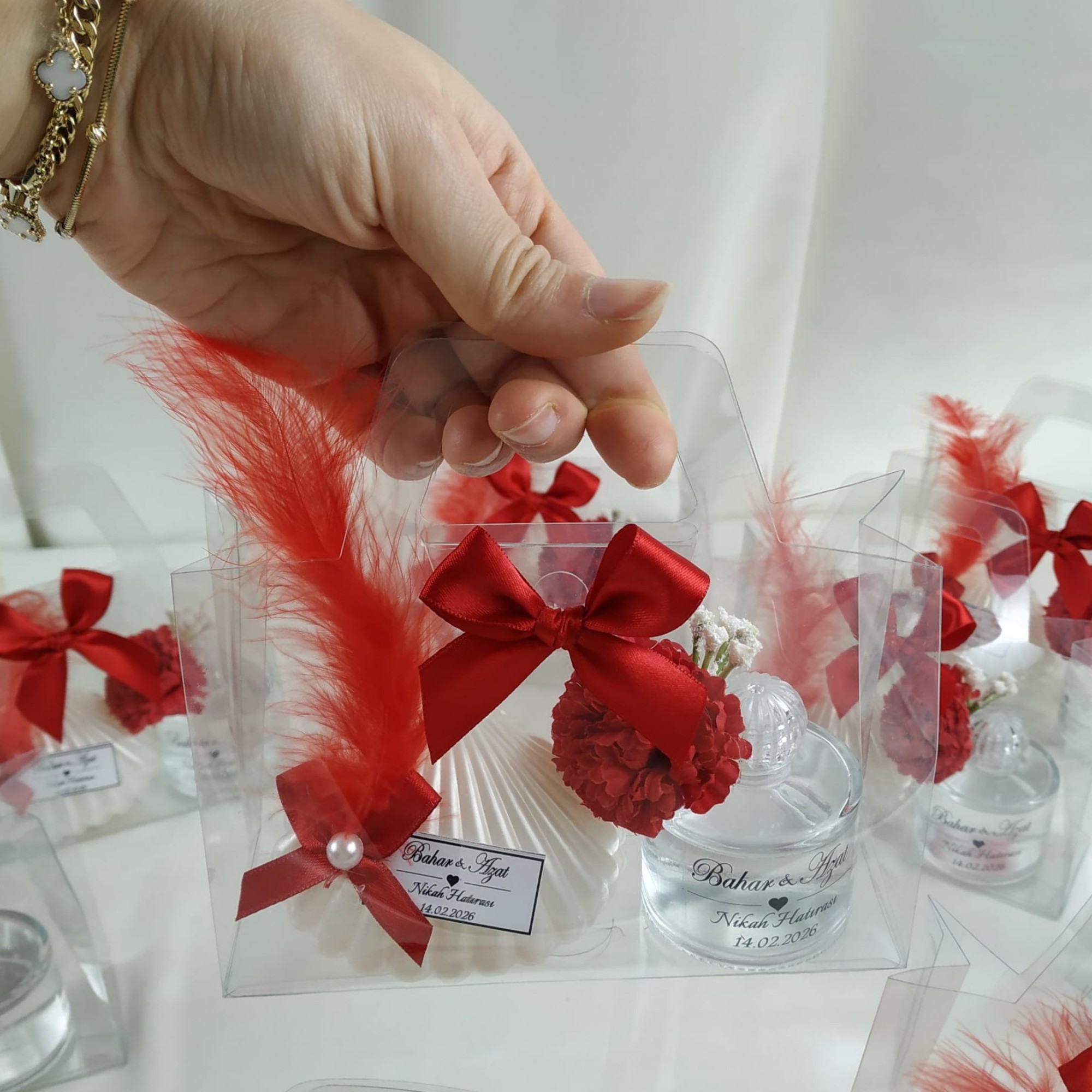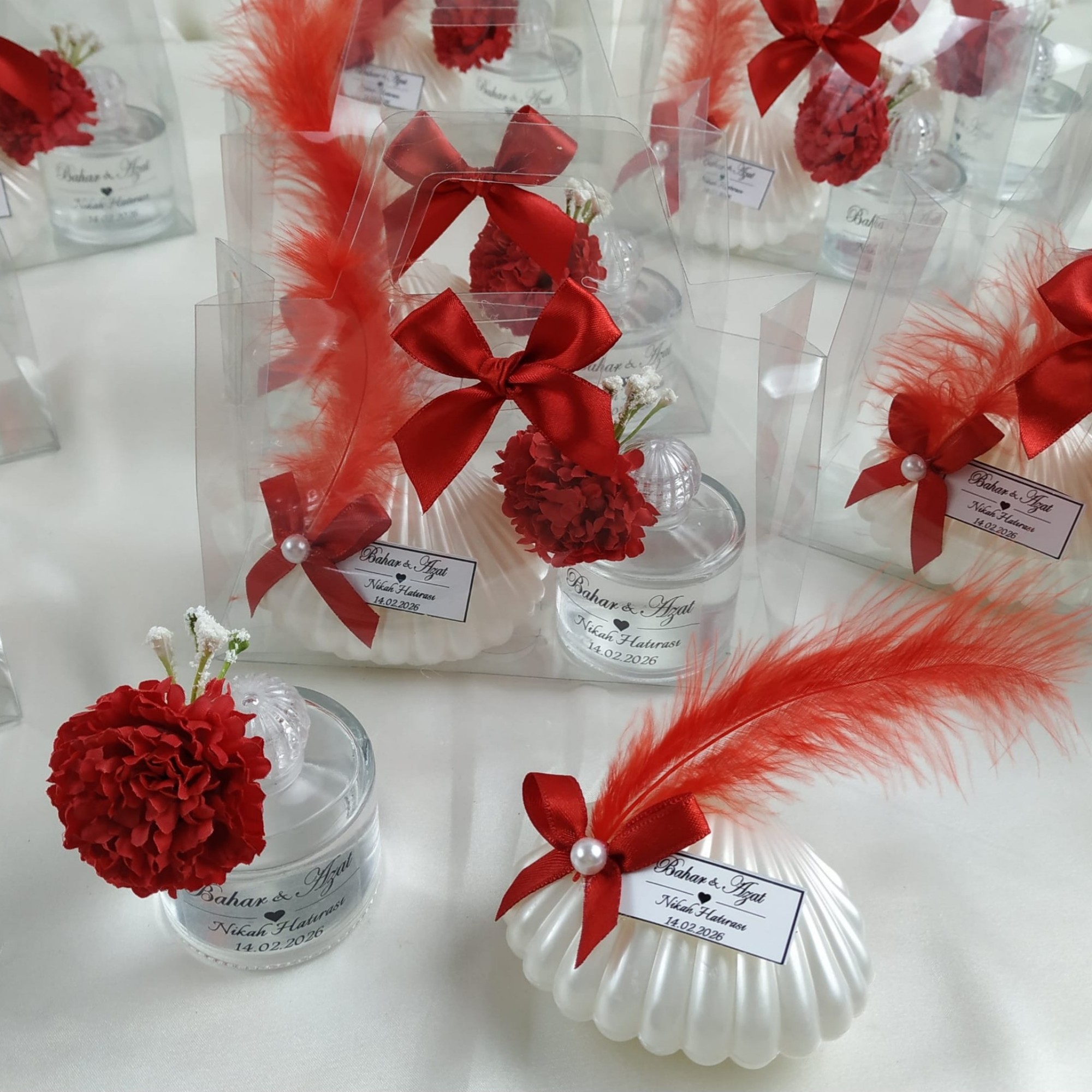 El emeğiyle hazırlanmış özel çantasında kolonya ve istiridye mum hediyelik, davetlileriniz için her biri özenle hazırlanmış ve kaliteli malzemelerle üretilmiştir.