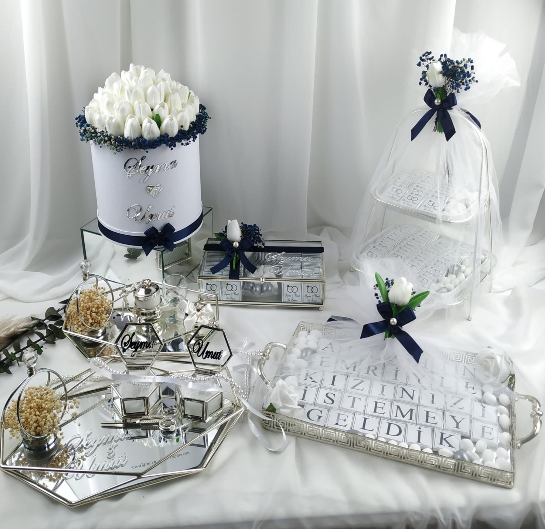 Zarafeti ve şıklığı bir arada sunan özel tasarım nişan tepsimiz, en özel gününüzde anınıza değer katmak için özenle hazırlanmıştır. Şıklığı, ışıltıyı ve inceliği bir araya getiren özel tasarım nişan tepsimiz, nişan ve söz törenlerinizi unutulmaz kılmak için özenle hazırlandı.