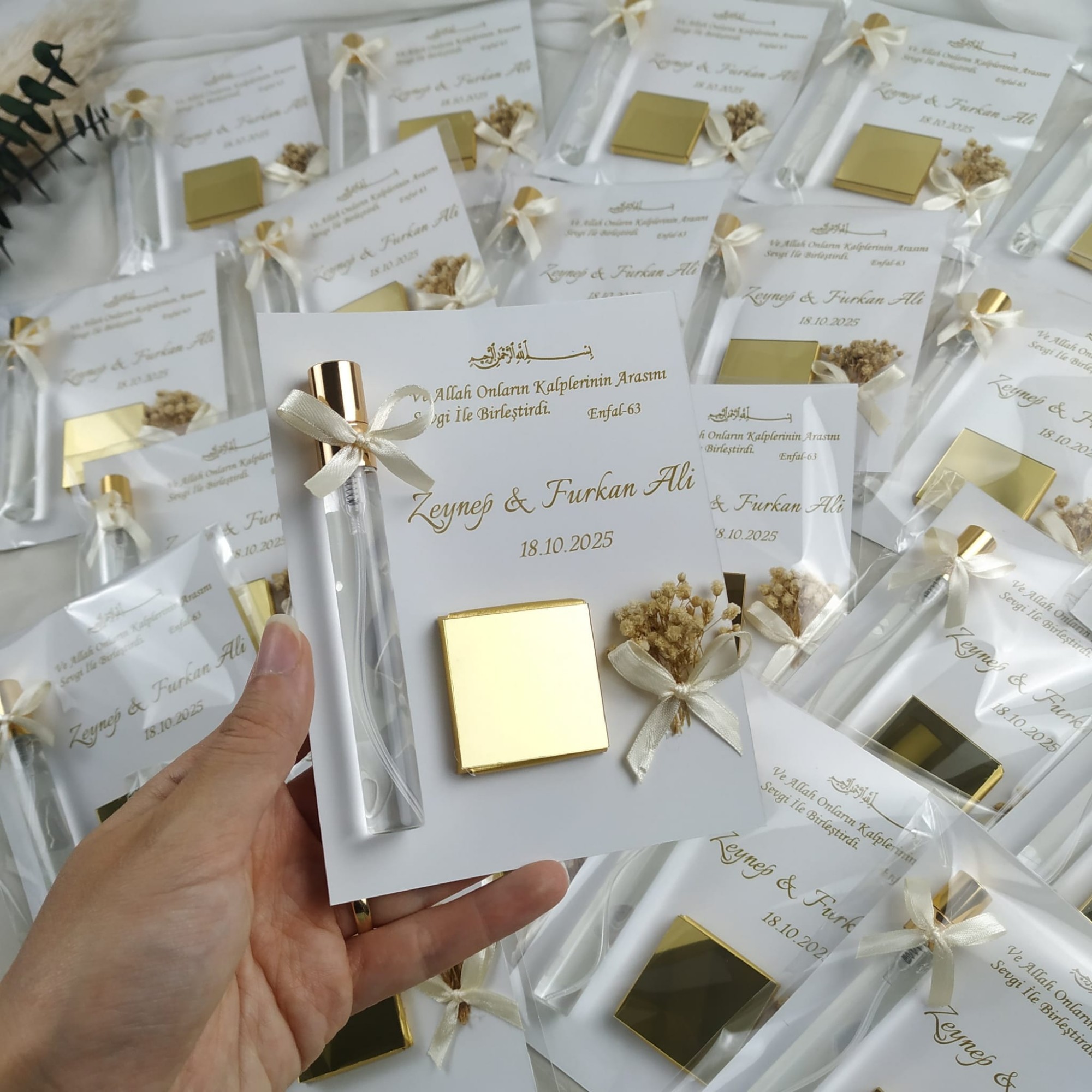 El emeğiyle hazırlanmış çikolata ve sprey kolonya hediyelik, davetlileriniz için her biri özenle hazırlanmış ve kaliteli malzemelerle üretilmiştir.