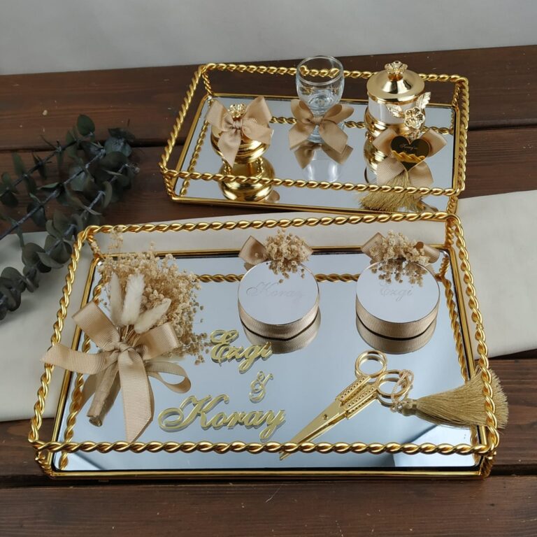 Hasır Tepsi Seti, Cam Kutu Söz Nişan Çikolatası ve Dekoratif İsimlik